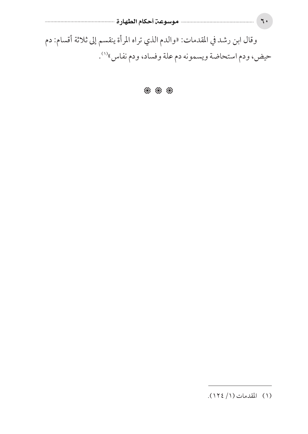 وقال ابن رشد في المقدمات: «والدم الذي تراه المرأة ينقسم إلى ثلاثة أقسام: دم حيض، ودم استحاضة ويسمونه دم علة وفساد، ودم نفاس» (¬١).