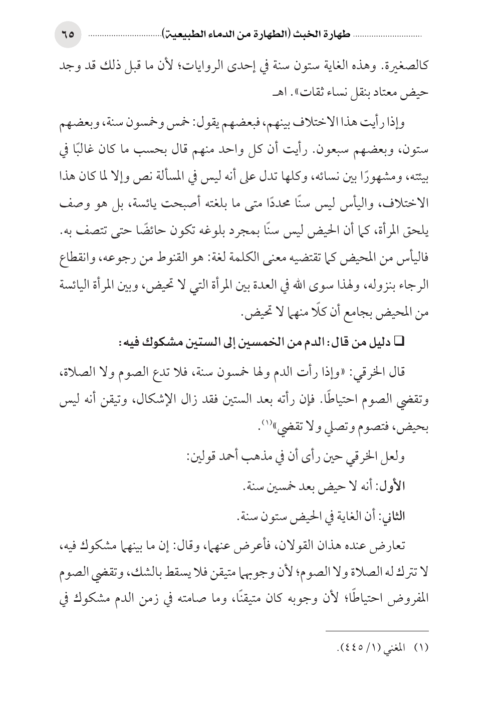 وإذا رأيت هذا الاختلاف بينهم، فبعضهم يقول: خمس وخمسون سنة، وبعضهم ستون، وبعضهم سبعون. رأيت أن كل واحد منهم قال بحسب ما كان غالبًا في بيئته، ومشهورًا بين نسائه، وكلها تدل على أنه ليس في المسألة نص وإلا لما كان هذا الاختلاف، واليأس ليس سنًا محددًا متى ما بلغته أصبحت يائسة، بل هو وصف يلحق المرأة، كما أن الحيض ليس سنًا بمجرد بلوغه تكون حائضًا حتى تتصف به. فاليأس من المحيض كما تقتضيه معنى الكلمة لغة: هو القنوط من رجوعه، وانقطاع الرجاء بنزوله، ولهذا سوى الله في العدة بين المرأة التي لا تحيض، وبين المرأة اليائسة من المحيض بجامع أن كلًا منهما لا تحيض.