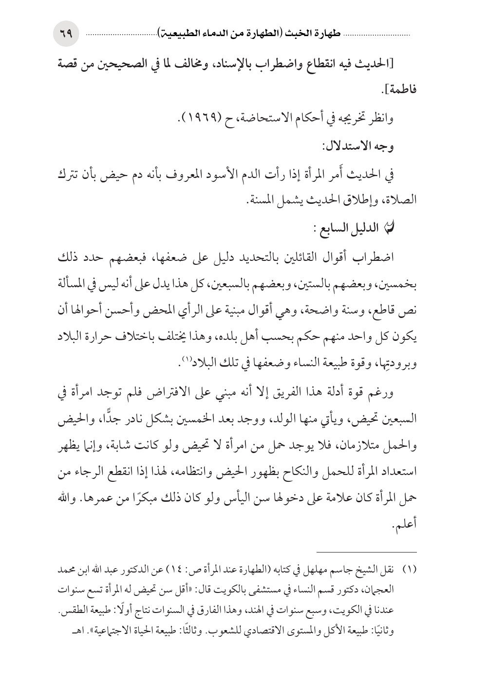 (¬١) نقل الشيخ جاسم مهلهل في كتابه (الطهارة عند المرأة ص: ١٤) عن الدكتور عبد الله ابن محمد العجمان، دكتور قسم النساء في مستشفى بالكويت قال: «أقل سن تحيض له المرأة تسع سنوات عندنا في الكويت، وسبع سنوات في الهند، وهذا الفارق في السنوات نتاج أولًا: طبيعة الطقس. وثانيًا: طبيعة الأكل والمستوى الاقتصادي للشعوب. وثالثًا: طبيعة الحياة الاجتماعية». اهـ