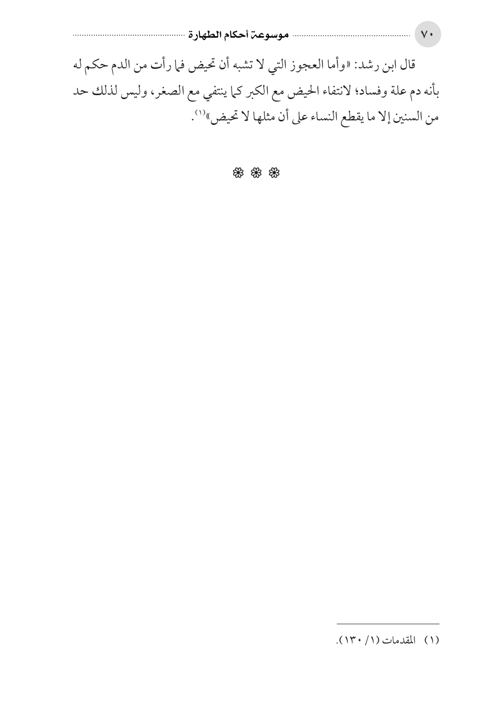 قال ابن رشد: «وأما العجوز التي لا تشبه أن تحيض فما رأت من الدم حكم له بأنه دم علة وفساد؛ لانتفاء الحيض مع الكبر كما ينتفي مع الصغر، وليس لذلك حد من السنين إلا ما يقطع النساء على أن مثلها لا تحيض» (¬١).