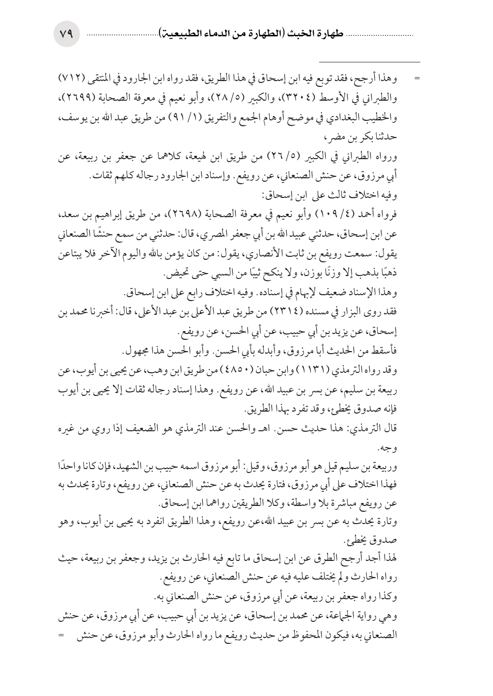 لهذا أجد أرجح الطرق عن ابن إسحاق ما تابع فيه الحارث بن يزيد، وجعفر بن ربيعة، حيث رواه الحارث ولم يختلف عليه فيه عن حنش الصنعاني، عن رويفع، وكذا رواه جعفر بن ربيعة، عن أبي مرزوق، عن حنش الصنعاني به.