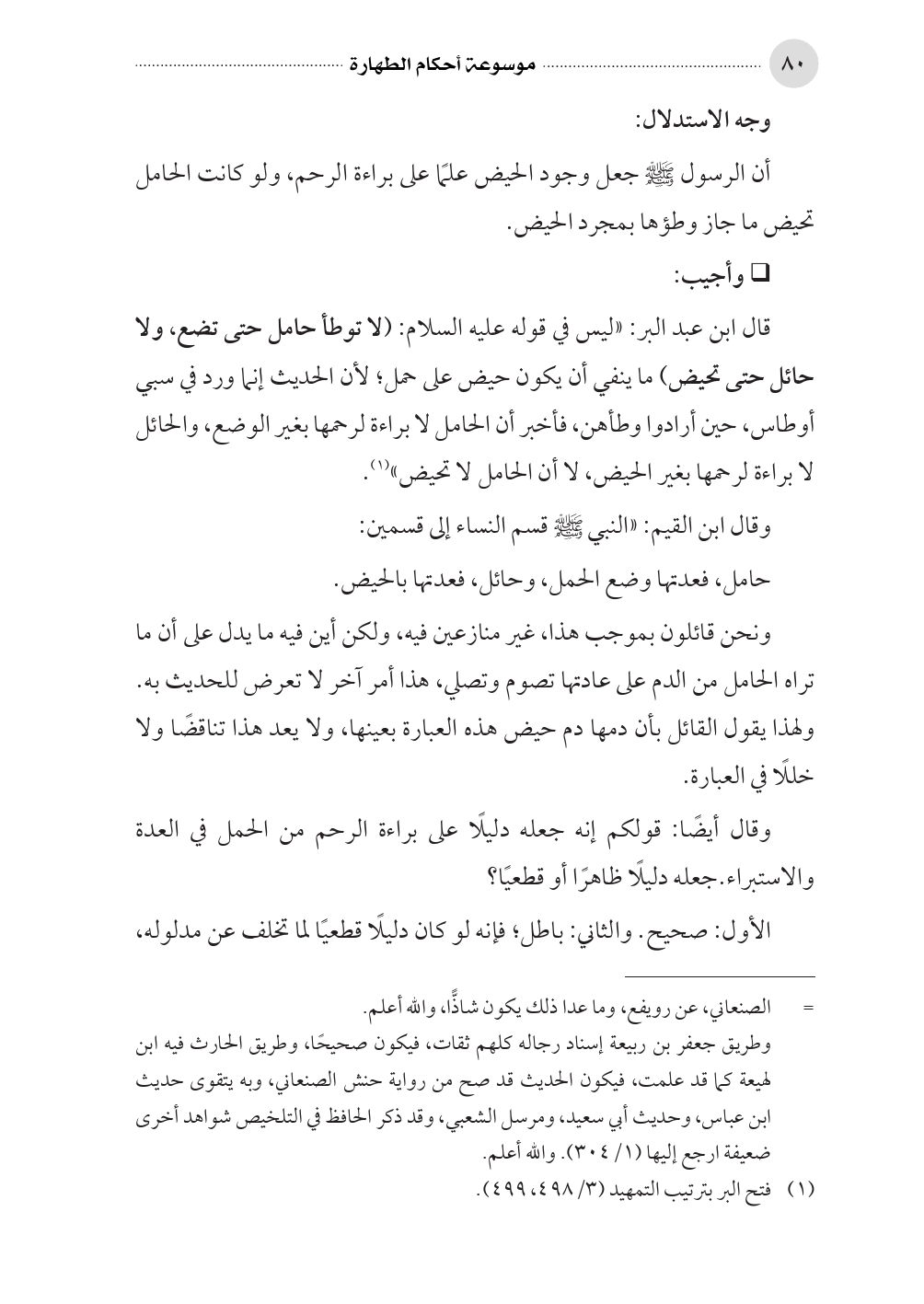 ونحن قائلون بموجب هذا، غير منازعين فيه، ولكن أين فيه ما يدل على أن ما تراه الحامل من الدم على عادتها تصوم وتصلي، هذا أمر آخر لا تعرض للحديث به. ولهذا يقول القائل بأن دمها دم حيض هذه العبارة بعينها، ولا يعد هذا تناقضًا ولا خللًا في العبارة.