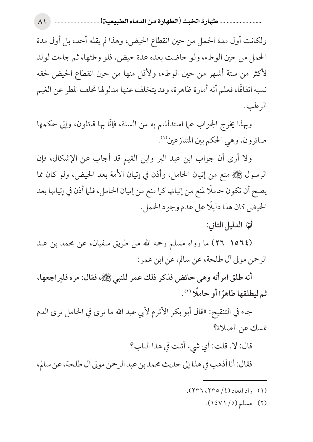 ولا أرى أن جواب ابن عبد البر وابن القيم قد أجاب عن الإشكال، فإن الرسول صلى الله عليه وسلم منع من إتيان الحامل، وأذن في إتيان الأمة بعد الحيض، ولو كان مما يصح أن تكون حاملًا لمنع من إتيانها كما منع من إتيان الحامل، فلما أذن في إتيانها بعد الحيض كان هذا دليلًا على عدم وجود الحمل.