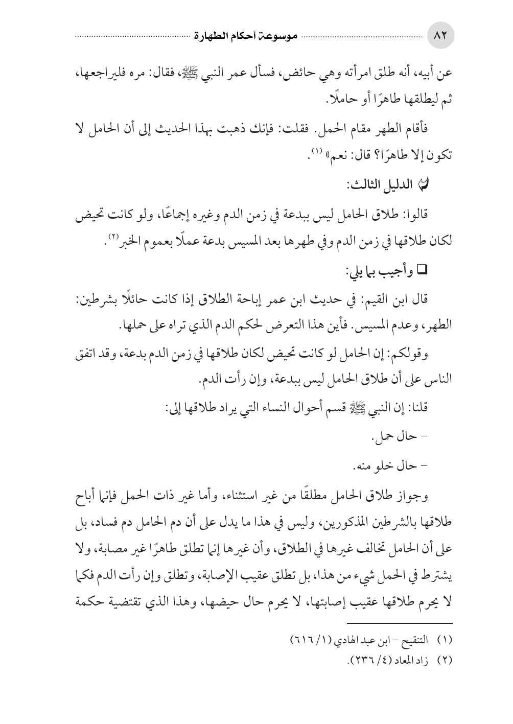 وقولكم: إن الحامل لو كانت تحيض لكان طلاقها في زمن الدم بدعة، وقد اتفق الناس على أن طلاق الحامل ليس ببدعة، وإن رأت الدم.
