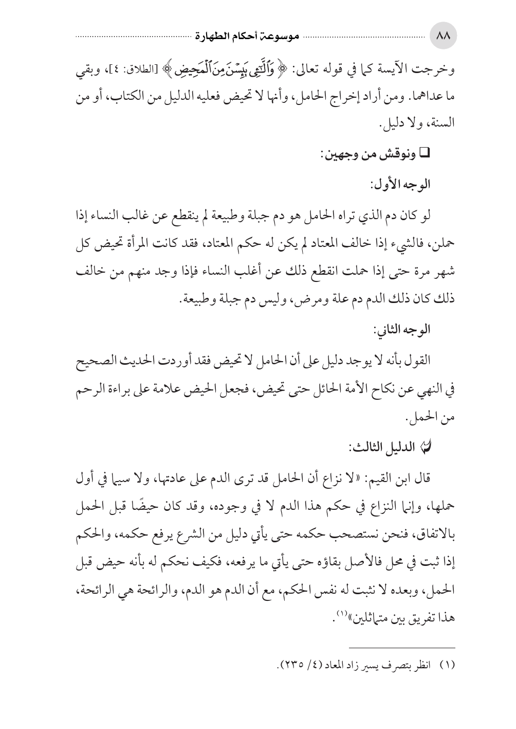 قال ابن القيم: «لا نزاع أن الحامل قد ترى الدم على عادتها، ولا سيما في أول حملها، وإنما النزاع في حكم هذا الدم لا في وجوده، وقد كان حيضًا قبل الحمل بالاتفاق، فنحن نستصحب حكمه حتى يأتي دليل من الشرع يرفع حكمه، والحكم إذا ثبت في محل فالأصل بقاؤه حتى يأتي ما يرفعه، فكيف نحكم له بأنه حيض قبل الحمل، وبعده لا نثبت له نفس الحكم، مع أن الدم هو الدم، والرائحة هي الرائحة، هذا تفريق بين متماثلين» (¬١).