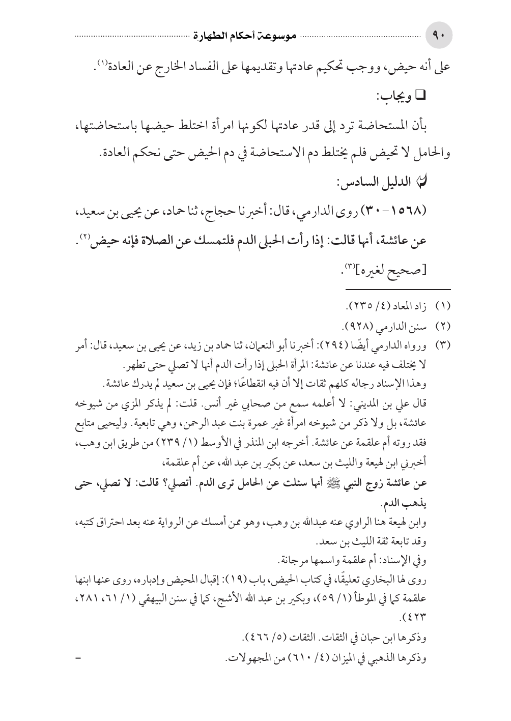 (¬٣) ورواه الدارمي أيضًا (٢٩٤): أخبرنا أبو النعمان، ثنا حماد بن زيد، عن يحيى بن سعيد، قال: أمر لا يختلف فيه عندنا عن عائشة: المرأة الحبلى إذا رأت الدم أنها لا تصلي حتى تطهر، وهذا الإسناد رجاله كلهم ثقات إلا أن فيه انقطاعًا؛ فإن يحيى بن سعيد لم يدرك عائشة.