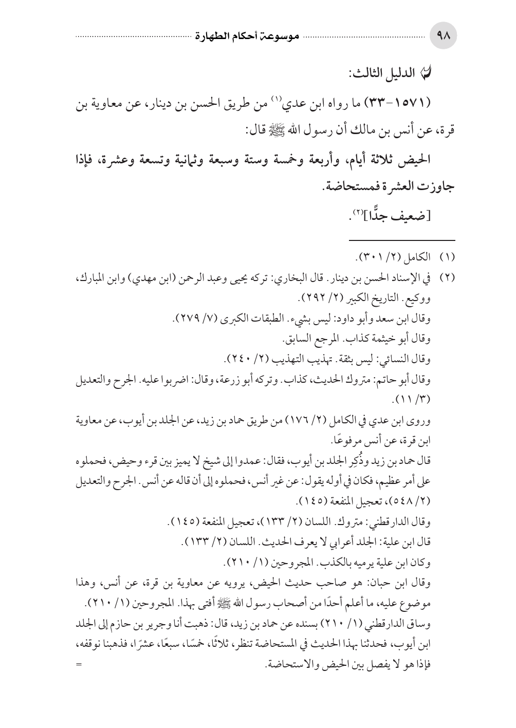 وساق الدارقطني (١/ ٢١٠) بسنده عن حماد بن زيد، قال: ذهبت أنا وجرير بن حازم إلى الجلد ابن أيوب، فحدثنا بهذا الحديث في المستحاضة تنظر، ثلاثًا، خمسًا، سبعًا، عشرًا، فذهبنا نوقفه، فإذا هو لا يفصل بين الحيض والاستحاضة. ...