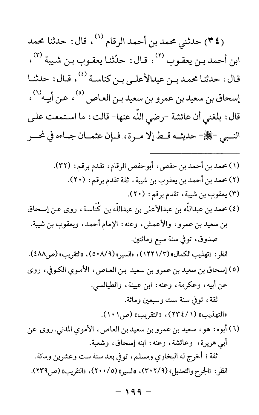 34 - حدثني محمد بن أحمد الرقام قال: حدثنا محمد بن أحمد بن يعقوب قال: حدثنا يعقوب بن شيبة قال: حدثنا محمد بن عبد الأعلى بن كناسة قال: حدثنا إسحاق بن سعيد بن عمرو بن سعيد بن العاص عن أبيه قال بلغني أن عن عائشة رضي الله عنها قالت ما استمعت على النبي صلى الله عليه وسلم حديثه قط إلا مرة فإن عثمان جاءه في نحر -[200]- الظهيرة فسمعت رسول الله صلى الله عليه وسلم يقول إن الله ملبسك قميصا يريدك أمتي على خلعه فلا تخلعه فلما رأيت عثمان يبذل لهم كل شيء سألوه إلا خلعه علمت أنه عهد من رسول الله صلى الله عليه وسلم.