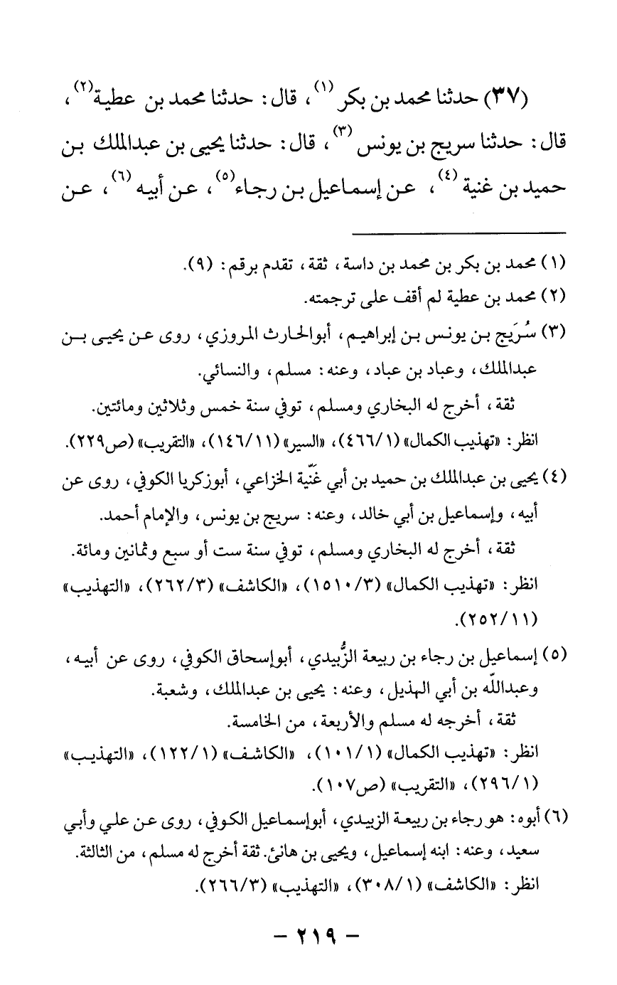 37 - حدثنا محمد بن بكر قال: حدثنا محمد بن عطية قال: حدثنا سريج بن يونس قال: حدثنا يحيى بن عبد الملك بن حميد بن غنية عن إسماعيل بن رجاء عن أبيه عن -[220]- أبي سعيد الخدري قال: قال رسول الله صلى الله عليه وسلم إن منكم من يقاتل على تأويل القرآن كما قاتلت على تنزيله فقال -[221]--[222]- أبو بكر أنا هو يا رسول الله قال لا قال عمر أنا هو يا رسول الله قال لا ولكن خاصف النعل قال فابتدرنا ننظر من هو فإذا هو علي يخصف نعل رسول الله صلى الله عليه وسلم