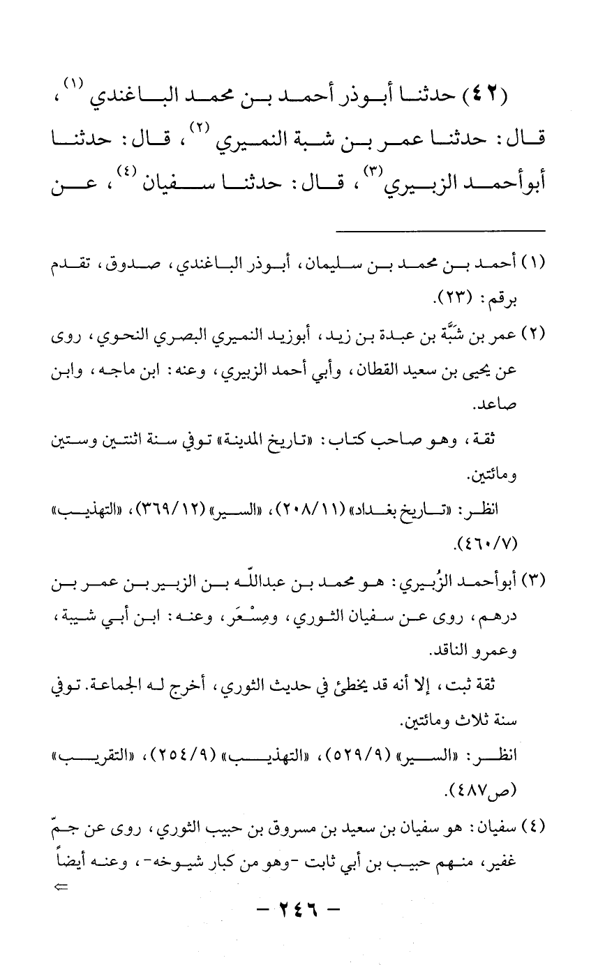 42 - حدثنا أبو ذر أحمد بن محمد الباغندي قال: حدثنا عمر بن شبة النميري قال: حدثنا أبو أحمد الزبيري قال: حدثنا سفيان عن -[247]- حبيب عن الضحاك المشرقي عن أبي سعيد الخدري عن النبي صلى الله عليه وسلم في حديث ذكر فيه قوما يخرجون على فرقة -[248]- من الناس مختلفة يقتلهم أقرب الطائفتين من الحق