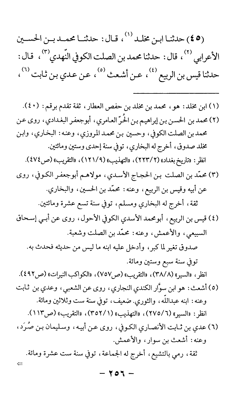 45 - حدثنا ابن مخلد قال: حدثنا محمد بن الحسين الأعرابي قال: حدثنا محمد بن الصلت الكوفي النهدي قال: حدثنا قيس بن الربيع عن أشعث عن عدي بن ثابت -[257]- عن أبي ظبيان عن علي رضي الله عنه قال أوصاني رسول الله صلى الله عليه وسلم فقال إذا وليت الأمر فأخرج أهل نجران من الحجاز