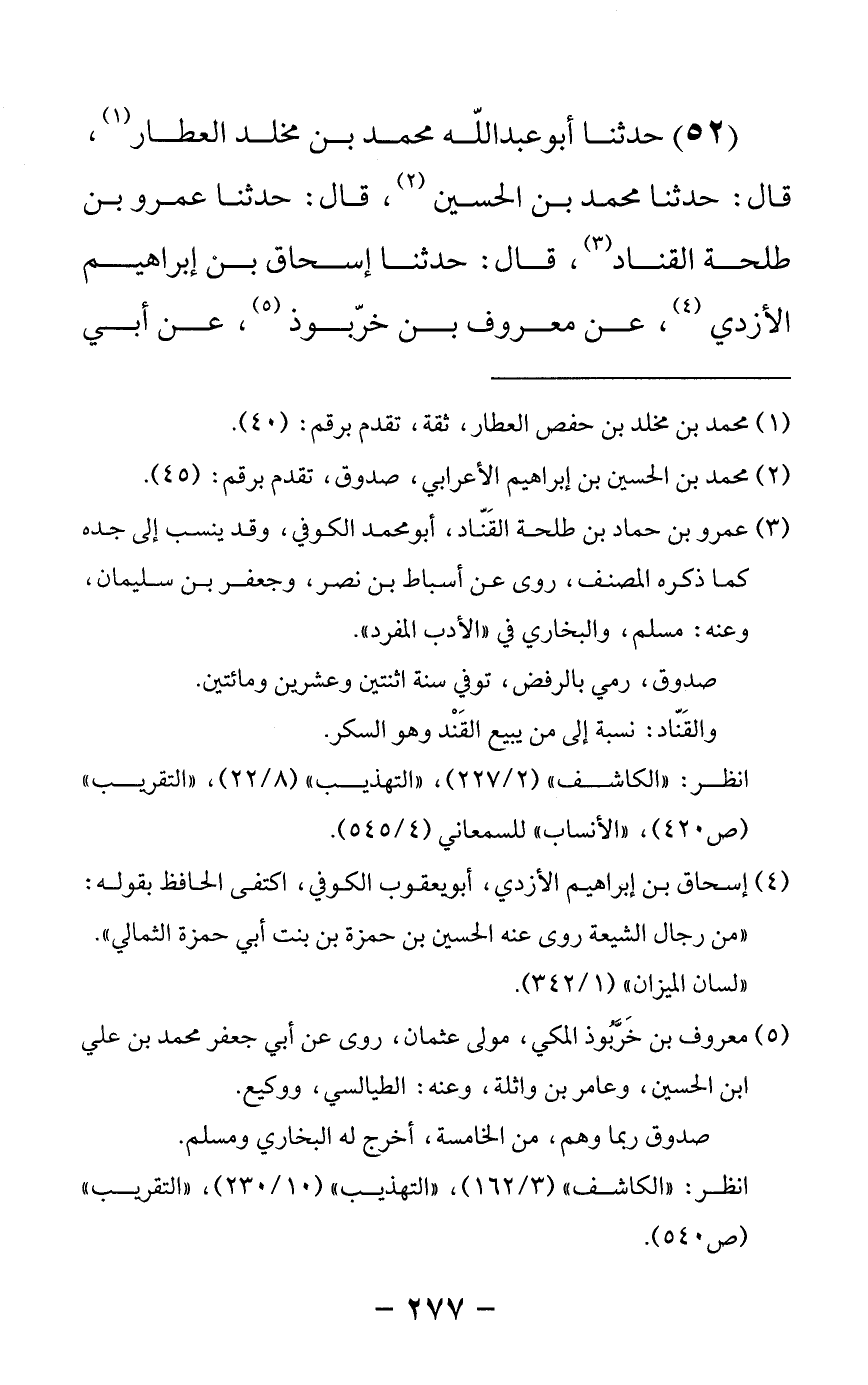 52 - حدثنا أبو عبدالله محمد بن مخلد العطار قال: حدثنا محمد بن الحسين قال: حدثنا عمرو بن طلحة القناد قال: حدثنا إسحاق بن إبراهيم الأزدي عن معروف بن خربوذ عن أبي -[278]- جعفر عن زيد بن أرقم قال: قال رسول الله صلى الله عليه وسلم ألا أحدثكم عمن إن استشرتموه لم تهلكوا ولم تضلوا قالوا: بلى يا رسول الله قال هو ذا هو علي قاعد, ثم قال: وازروه وناصحوه وصدقوه, ثم قال: إن جبريل أمرني بما قلت لكم