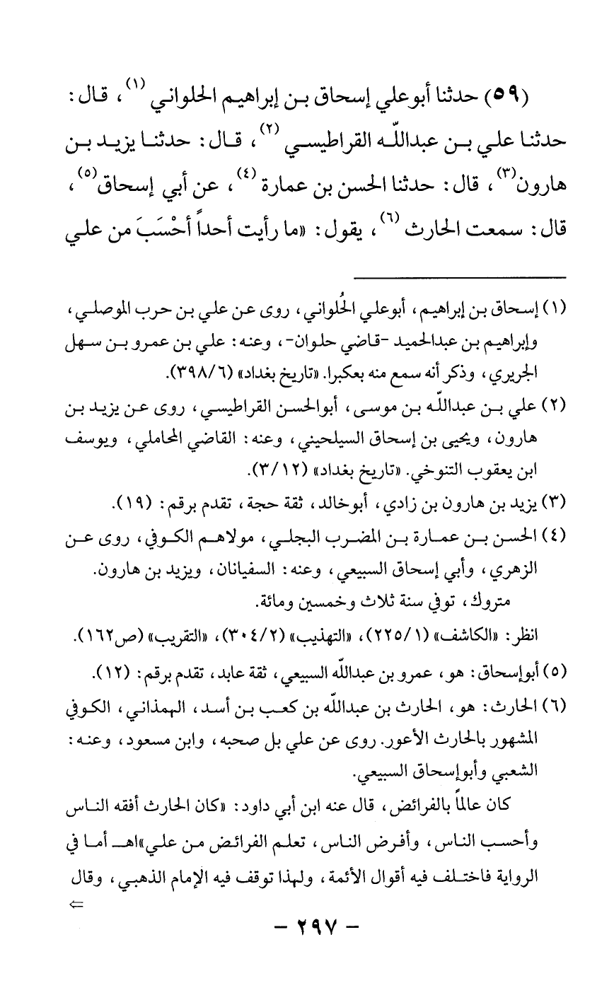 59 - حدثنا أبو علي إسحاق بن إبراهيم الحلواني قال: حدثنا علي بن عبدالله القراطيسي قال: حدثنا يزيد بن هارون قال: حدثنا الحسن بن عمارة عن أبي إسحاق قال: سمعت الحارث يقول ما رأيت أحدا أحسب من علي -[298]- بن أبي طالب أتاه آت فقال يا أمير المؤمنين رجل مات وترك ابنتيه وأبويه وامرأته فقال صار ثمنها تسعا