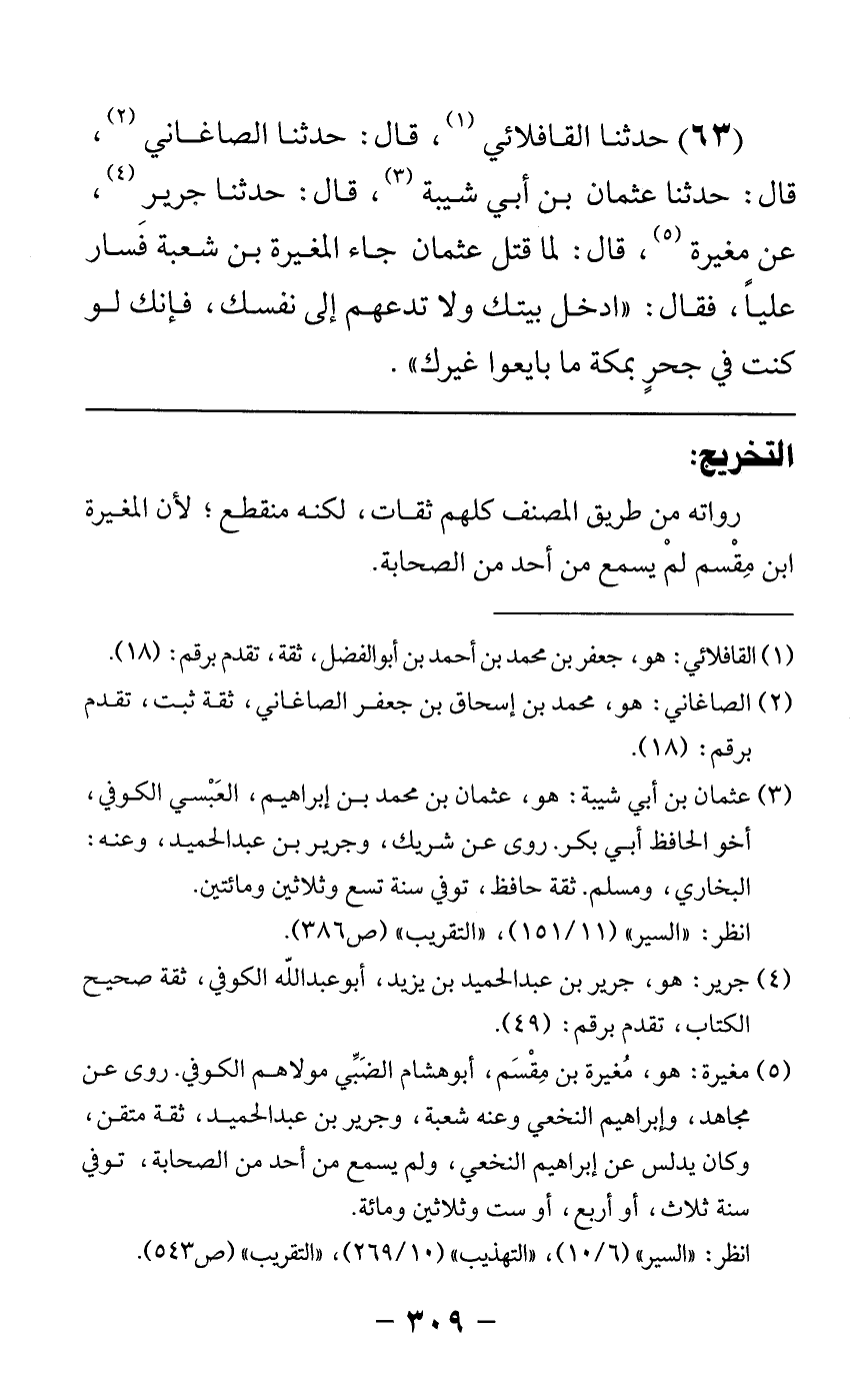 63 - حدثنا القافلائي قال: حدثنا الصاغاني قال: حدثنا عثمان بن أبي شيبة قال: حدثنا جرير عن مغيرة قال لما قتل عثمان جاء المغيرة بن شعبة فسار عليا فقال ادخل بيتك ولا تدعهم إلى نفسك فإنك لو كنت في جحر بمكة ما بايعوا غيرك