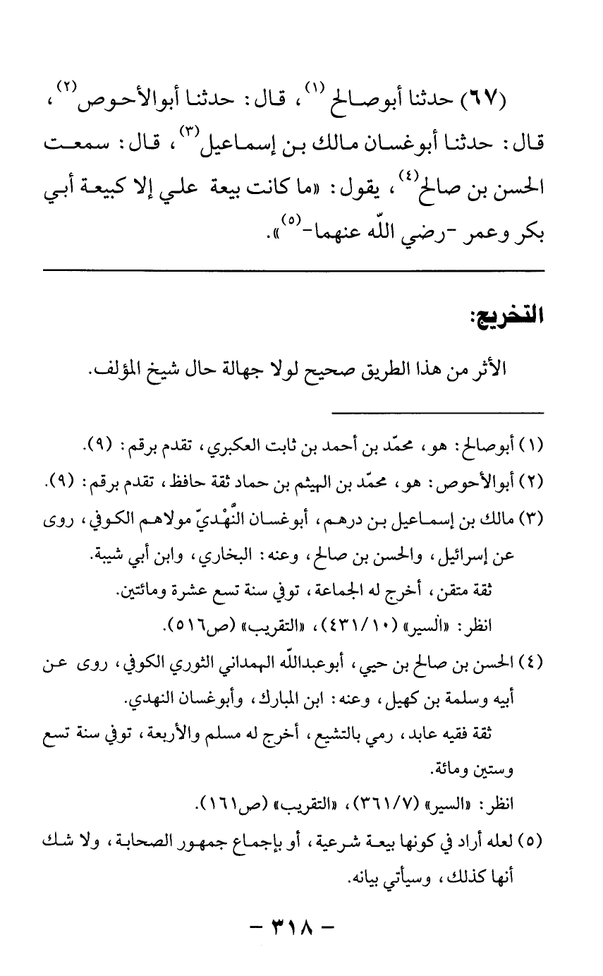 67 - حدثنا أبو صالح قال: حدثنا أبو الأحوص قال: حدثنا أبو غسان مالك بن إسماعيل قال: سمعت الحسن بن صالح يقول ما كانت بيعة علي إلا كبيعة أبي بكر وعمر رضي الله عنهما