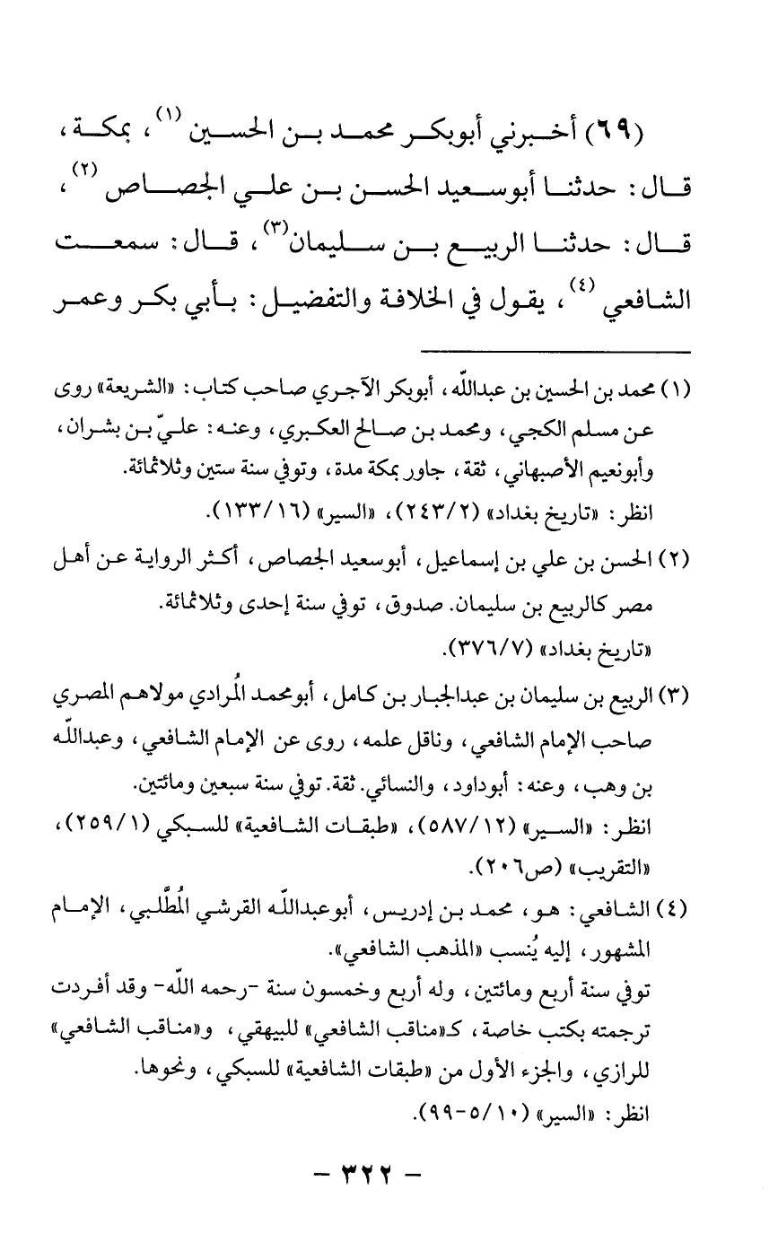 69 - أخبرني أبو بكر محمد بن الحسين بمكة قال: حدثنا أبو سعيد الحسن بن علي الجصاص قال: حدثنا الربيع بن سليمان قال: سمعت الشافعي يقول في الخلافة والتفضيل بأبي بكر وعمر -[323]- وعثمان وعلي رحمهم الله