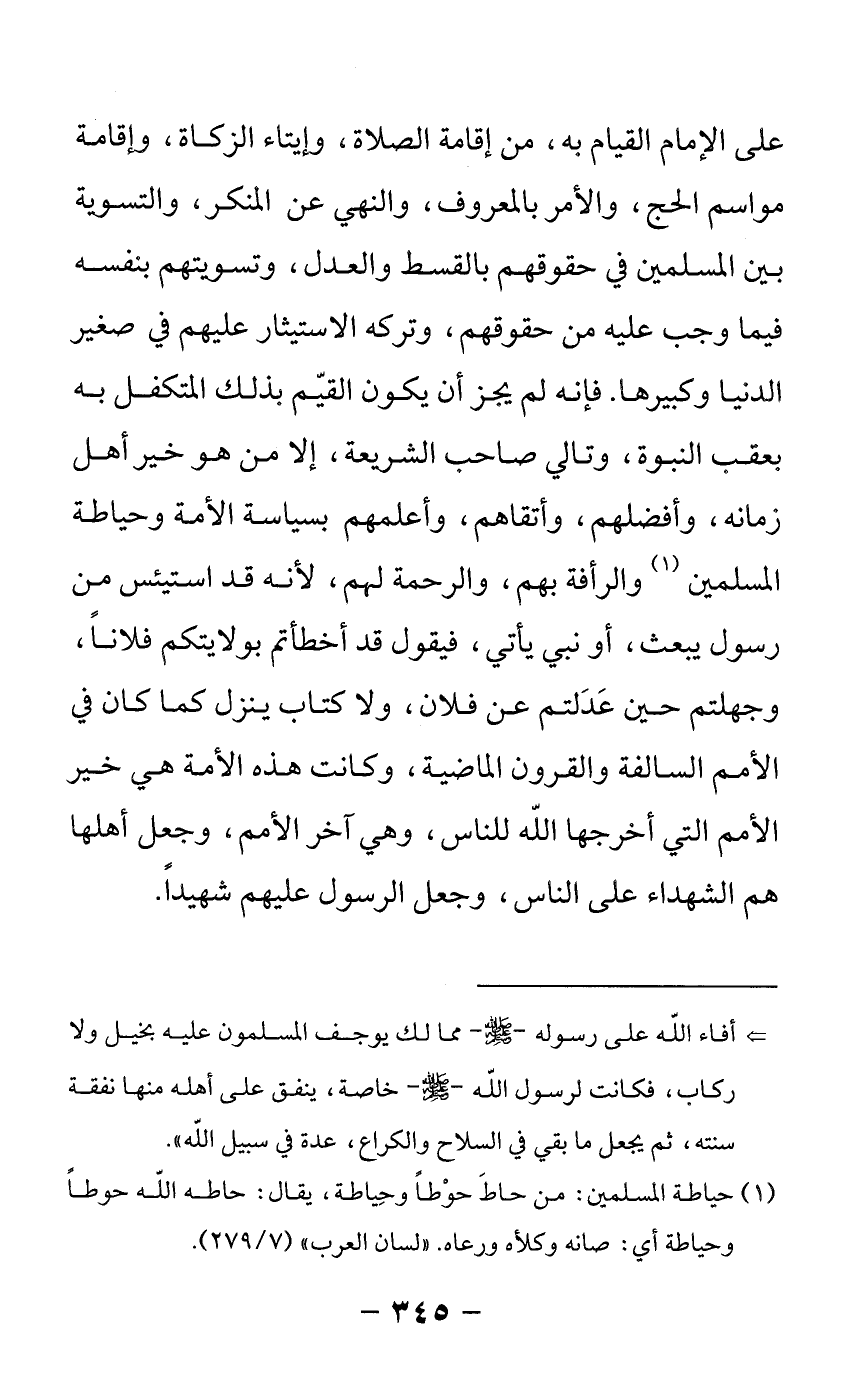 على الإمام القيام به، من إقامة الصلاة، وإيتاء الزكاة، وإقامة مواسم الحج، والأمر بالمعروف، والنهي عن المنكر، والتسوية بين المسلمين في حقوقهم بالقسط والعدل، وتسويتهم بنفسه فيما وجب عليه من حقوقهم، وتركه الاستيثار عليهم في صغير الدنيا وكبيرها. فإنه لم يجز أن يكون القيّم بذلك المتكفل به بعقب النبوة، وتالي صاحب الشريعة، إلا من هو خير أهل زمانه، وأفضلهم، وأتقاهم، وأعلمهم بسياسة الأمة وحياطة المسلمين والرأفة بهم، والرحمة لهم، لأنه قد استيئس من رسول يبعث، أو نبي يأتي، فيقول قد أخطأتم بولايتكم فلاناً، وجهلتم حين عَدَلتم عن فلان، ولا كتاب ينزل كما كان في الأمم السالفة والقرون الماضية، وكانت هذه الأمة هي خير الأمم التي أخرجها الله للناس، وهي آخر الأمم، وجعل أهلها هم الشهداء على الناس، وجعل الرسول عليهم شهيداً.