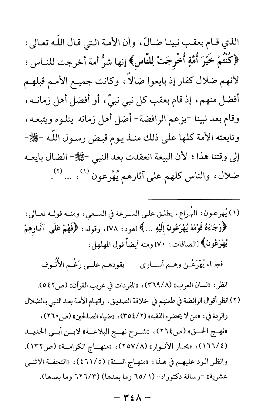 الذي قام بعقب نبينا ضالّ، وأن الأمة التي قال الله تعالى: {كنتم خير أمة أخرجت للناس} إنها شرُّ أمة أخرجت للناس؛ لأنهم ضلال كفار إذ بايعوا ضالاً، وكانت جميع الأمم قبلهم أفضل منهم، إذ قام بعقب كل نبي نبيٌ، أو أفضل أهل زمانه، وقام بعد نبينا -بزعم الرافضة- أضل أهل زمانه يتلوه ويتبعه، وتابعته الأمة كلها على ذلك منذ يوم قبض رسول الله صلى الله عليه وسلم إلى وقتنا هذا؛ لأن البيعة انعقدت بعد النبي صلى الله عليه وسلم الضال بايعه ضلال، والناس كلهم على آثارهم يُهْرعون، ....