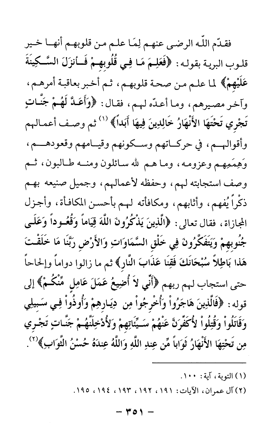 فقدم الله الرضى عنهم لِمَا علم من قلوبهم أنها خير قلوب البرية بقوله: {فعلم ما في قلوبهم فأنزل السكينة عليهم} لما علم من صحة قلوبهم، ثم أخبر بعاقبة أمرهم، وآخر مصيرهم، وما أعده لهم، فقال: {وأعد لهم جنات تجري تحتها الأنهار خالدين فيها أبدا} ثم وصف أعمالهم وأقوالهم، في حركاتهم وسكونهم وقيامهم وقعودهم، وَهِمَمِهم وعزومه، وما هم لله سائلون ومنه طالبون، ثم وصف استجابته لهم، وحفظه لأعمالهم، وجميل صنيعه بهم، ذكْراً يُفهم، وأثابهم، ومكافأته لهم بأحسن المكافأة، وأجزل المجازاة، فقال تعالى: {الذين يذكرون الله قياما وقعودا وعلى جنوبهم ويتفكرون في خلق السماوات والأرض ربنا ما خلقت هذا باطلا سبحانك فقنا عذاب النار} ثم ما زالوا دواماً وإلحاحاً حتى استجاب لهم ربهم {أني لا أُضيع عمل عامل منكم {إلى قوله: {فالذين هاجروا وأخرجوا من ديارهم وأوذوا في سبيلي وقاتلوا وقتلوا لأكفرن عنهم سيئاتهم ولأدخلنهم جنات تجري من تحتها الأنهار ثوابا من عند الله والله عنده حسن الثواب}.