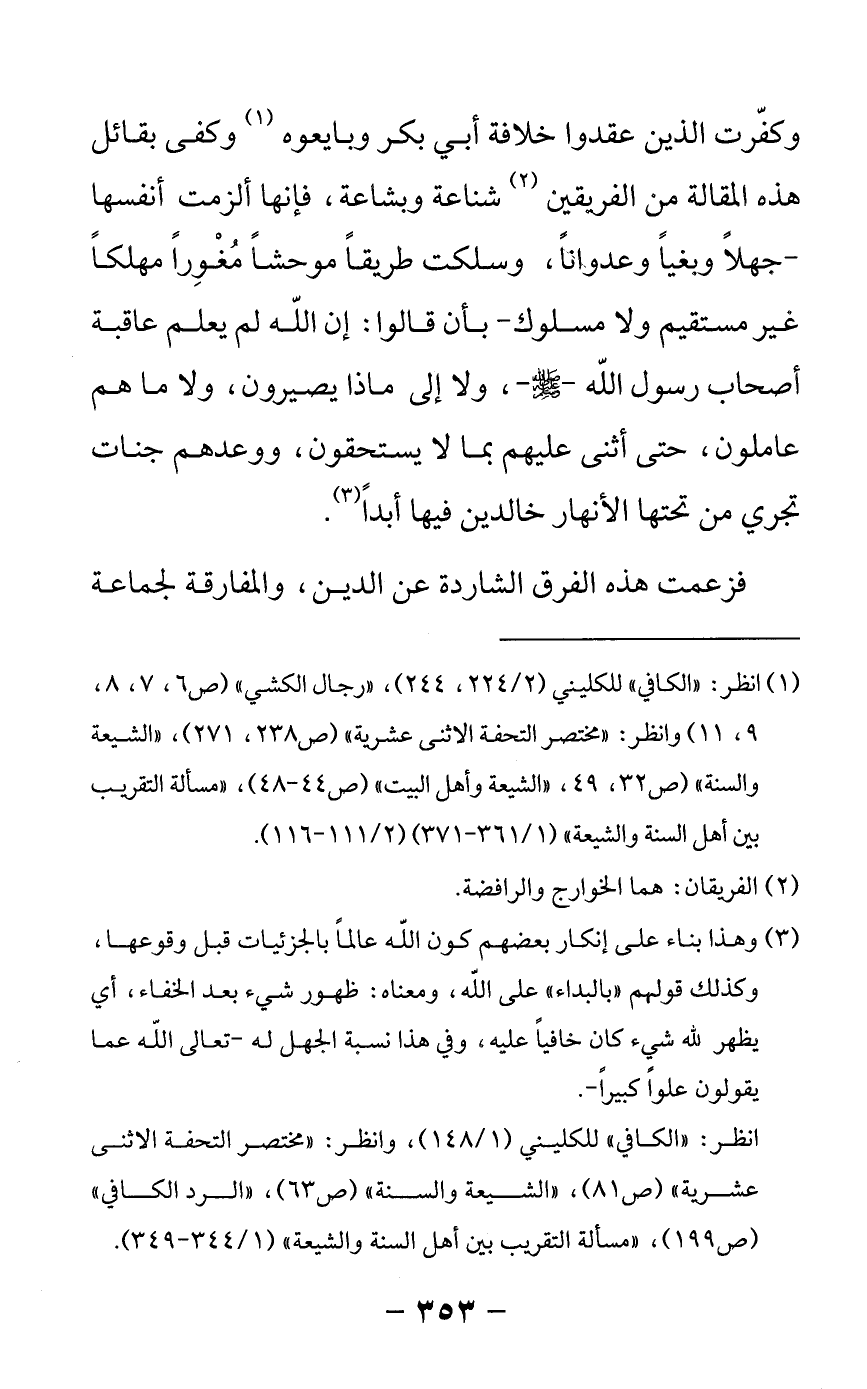 وكفّرت الذين عقدوا خلافة أبي بكر وبايعوه وكفى بقائل هذه المقالة من الفريقين شناعة وبشاعة، فإنها ألزمت أنفسها -جهلاً وبغياً وعدواناً، وسلكت طريقاً موحشاً مُغْوِراً مهلكا غير مستقيم ولا مسلوك- بأن قالوا: إن الله لم يعلم عاقبة أصحاب رسول الله صلى الله عليه وسلم، ولا إلى ماذا يصيرون، ولا ما هم عاملون، حتى أثنى عليهم بما لا يستحقون، ووعدهم جنات تجري من تحتها الأنهار خالدين فيها أبداً.