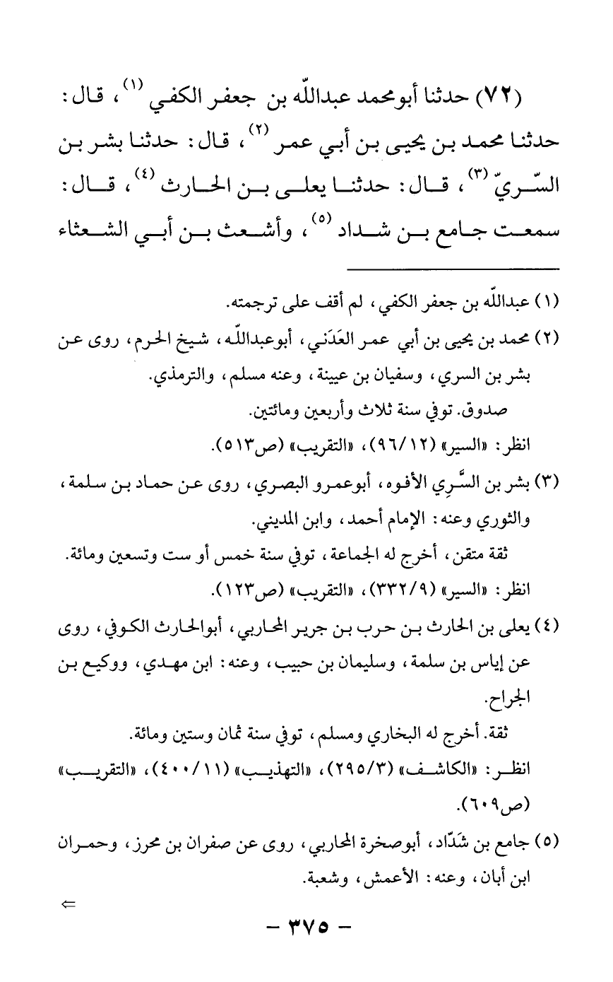 72 - حدثنا أبو محمد عبدالله بن جعفر الكفي قال: حدثنا محمد بن يحيى بن أبي عمر قال: حدثنا بشر بن السري قال: حدثنا يعلى بن الحارث قال: سمعت جامع بن شداد وأشعث بن أبي الشعثاء -[376]- المحاربي يترادان هذا الحديث: أن أهل نجران لقوا عليا إما قال في القصر وإما في سكة البكريين فقال قد شهدت كتابنا فلم ينكر ذلك وطلبوا إليه أن يردهم فقال إن ذلك رجل لم نتدبر من أمره قط إلا -[377]- اليُمن وإني والله لا أحل عقدة عقدها أبدا حتى ألقى الله، يعني عمر