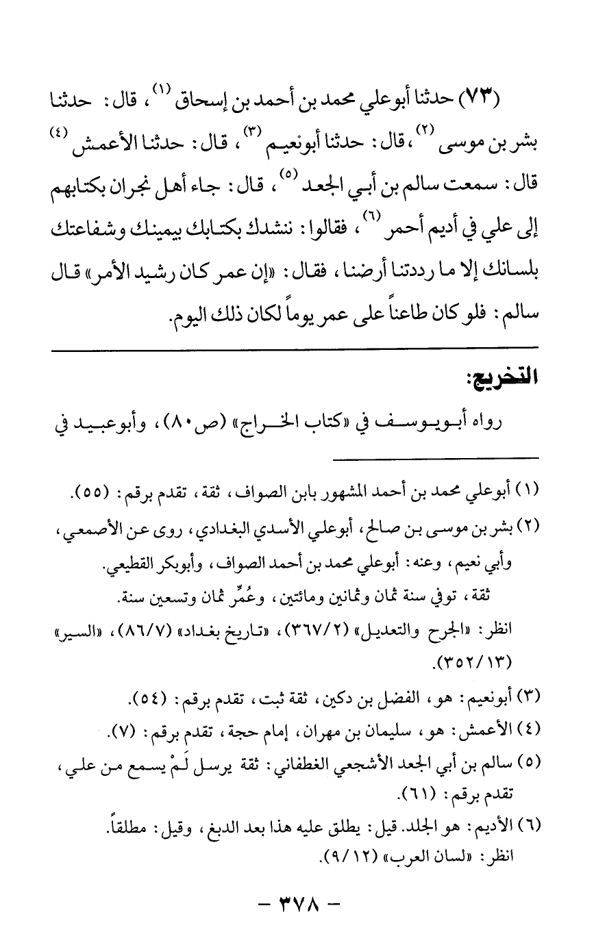 73 - حدثنا أبو علي محمد بن أحمد بن إسحاق قال: حدثنا بشر بن موسى قال: حدثنا أبو نعيم قال: حدثنا الأعمش قال: سمعت سالم بن أبي الجعد قال جاء أهل نجران بكتابهم إلى علي في أديم أحمر فقالوا ننشدك بكتابك بيمينك وشفاعتك بلسانك إلا ما رددتنا أرضنا فقال إن عمر كان رشيد الأمر قال سالم فلو كان طاعناً على عمر يوما لكان ذلك اليوم