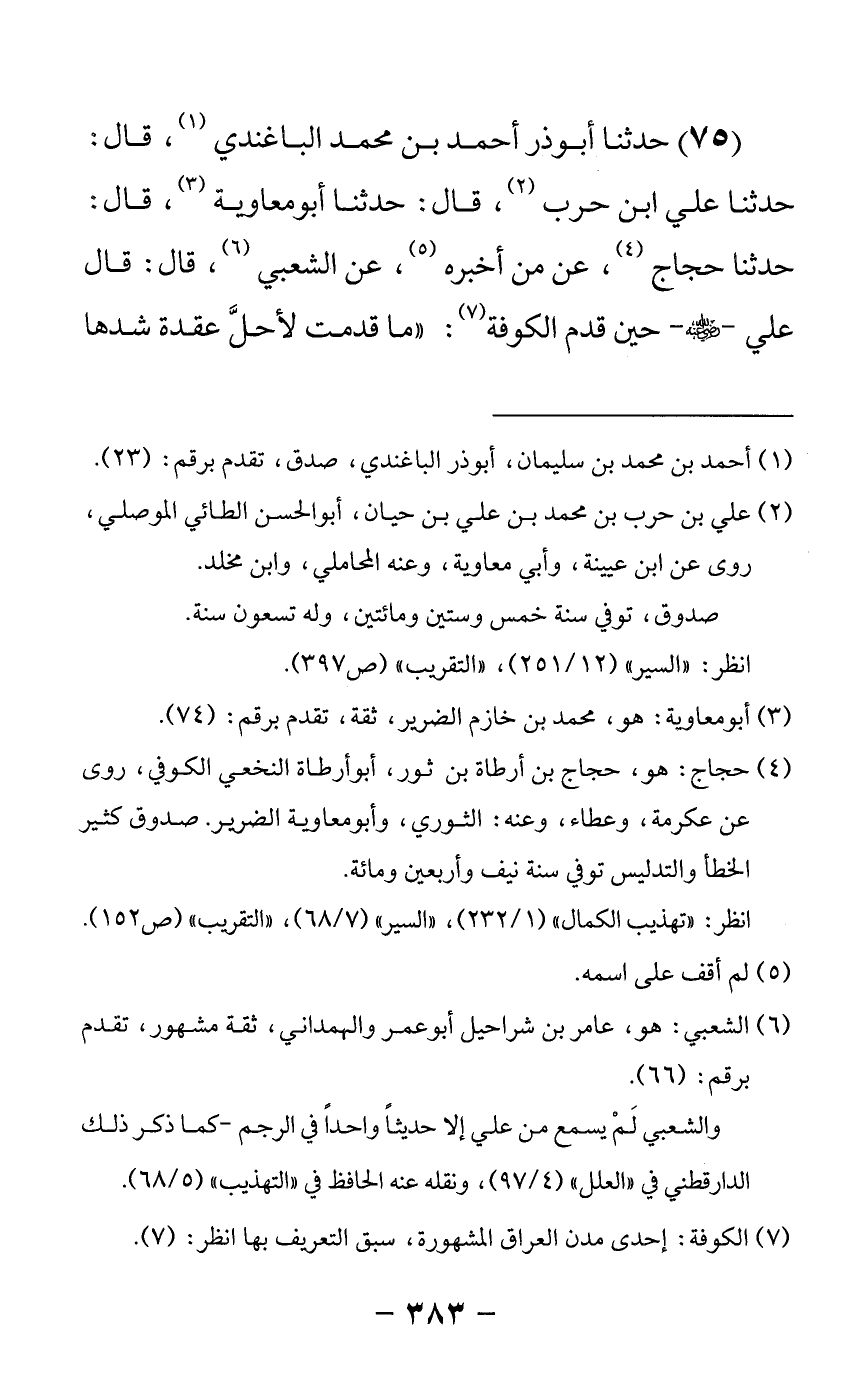 75 - حدثنا أبو ذر أحمد بن محمد الباغندي قال: حدثنا علي بن حرب قال: حدثنا أبو معاوية قال حدثنا حجاج عمن أخبره عن الشعبي قال قال علي رضي الله عنه حين قدم الكوفة ما قدمت لأحل عقدة شدها -[384]- عمر بن الخطاب رضي الله عنه