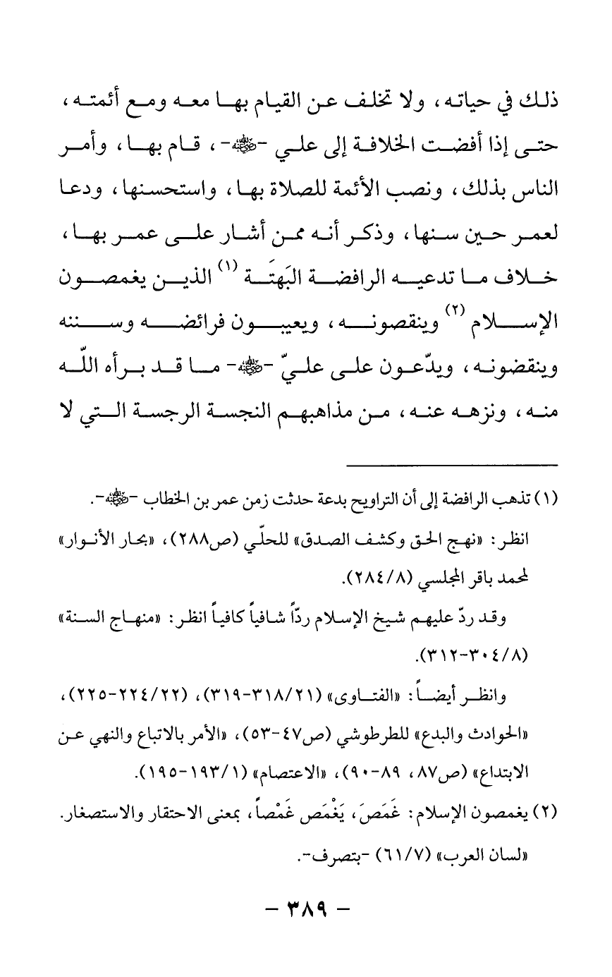 قال الشيخ: وهكذا كان صنيع علي رضي الله عنه فيما سَنّه عمر للناس من قيام شهر رمضان لصلاة التراويح، ما أنكر -[388]--[389]- ذلك في حياته، ولا تخلف عن القيام بها معه ومع أئمته، حتى إذا أفضت الخلافة إلى علي رضي الله عنه، قام بها، وأمر الناس بذلك، ونصب الأئمة للصلاة بها، واستحسنها، ودعا لعمر حين سنها، وذكر أنه ممن أشار على عمر بها، خلاف ما تدعيه الرافضة البَهتَة الذين يغمصون الإسلام وينقصونه، ويعيبون فرائضه وسننه وينقضونه، ويدعون على عليّ رضي الله عنه ما قد برأه الله منه، ونزهه عنه، من مذاهبهم النجسة الرجسة التي لا -[390]- يستحسنها غيرهم، ولا يستحلها سواهم.