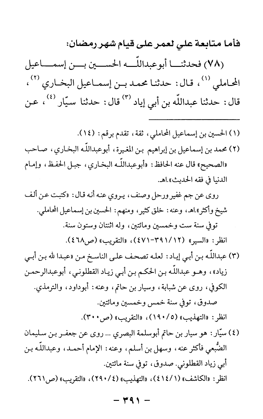 78 - فحدثنا أبو عبدالله الحسين بن إسماعيل المحاملي قال: حدثنا محمد بن إسماعيل البخاري قال: حدثنا عبدالله بن أبي إياد قال: حدثنا سيار عن -[392]- جعفر قال: حدثنا قطن القطعي عن أبي إسحاق الهمداني قال مر علي بن أبي طالب في أول ليلة من شهر رمضان فسمع قراءة القرآن من المساجد ورأى القناديل تزهر فقال نور الله لعمر بن الخطاب في قبره كما أنار مساجد الله بالقرآن