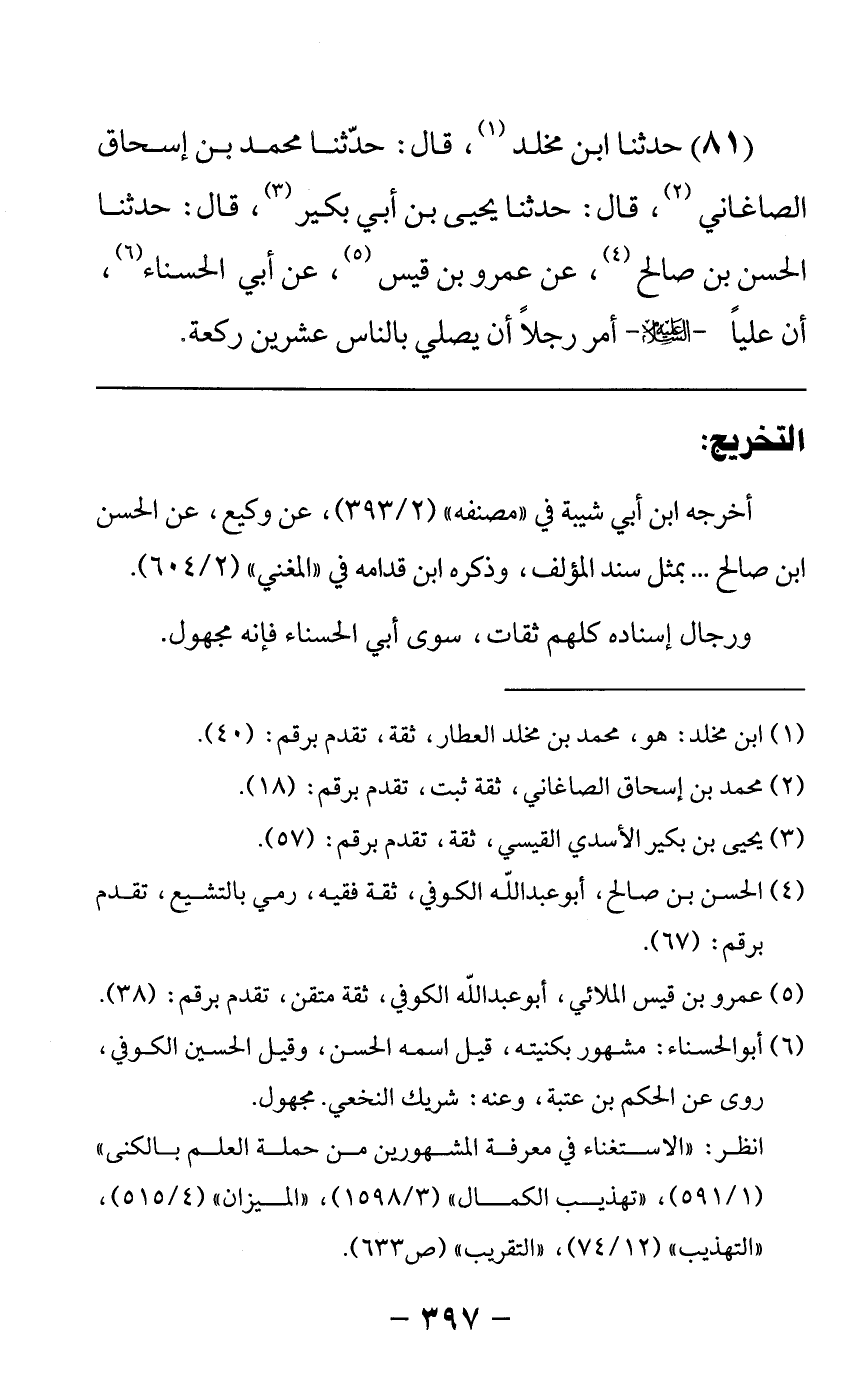 81 - حدثنا ابن مخلد قال: حدثنا محمد بن إسحاق الصاغاني قال: حدثني يحيى بن بكير قال: حدثنا الحسن بن صالح عن عمرو بن قيس عن أبي الحسناء أن عليا عليه السلام أمر رجلا أن يصلي بالناس عشرين ركعة