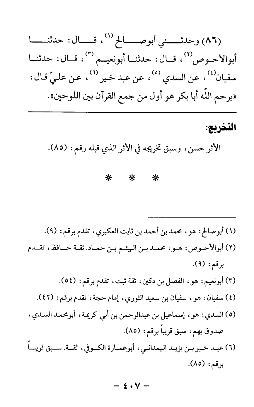 86 - وحدثني أبو صالح قال: حدثنا أبو الأحوص قال: حدثنا أبو نعيم قال: حدثنا سفيان عن السدي عن عبد خير عن علي رضي الله عنه قال يرحم الله أبا بكر هو أول من جمع القرآن بين اللوحين