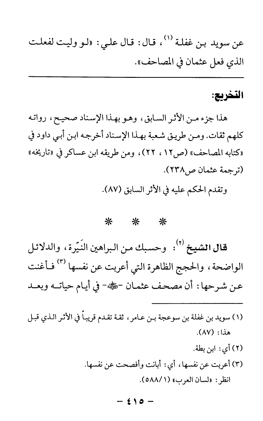 قال الشيخ: وحسبك من البراهين النيرة، والدلائل الواضحة، والحجج الظاهرة التي أعربت عن نفسها فأغنت عن شرحها: أن مصحف عثمان - رضي الله عنه - في أيام حياته وبعد -[416]- وفاته، به وبما فيه كان يقرأ علي بن أبي طالب - رضي الله عنه - هو وأولاده وأهل بيته وأصحابه، ما غير منه حرفاً ولا قدم منه مؤخرا، ولا أخر مقدما، ولا أحدث فيه شيئاً، ولا نقص منه شيئاً، ولا قال ذلك ولا فعله أحد من أهل بيته ولا من أصحابه، لكنهم كلهم مجمعون على القراءة بما في مصحف عثمان - رحمه الله -، وما زالوا بذلك وعلى ذلك حتى فارقوا الدنيا - رحمة الله عليهم - فمن ادعى عليهم غير ذلك فقد كذب وأثم واختلق الزور والبهتان، وقال ما يعلم أهل الإسلام جميعاً إحالته فيه، والله حسبه وهو حسبنا ونعم الوكيل.