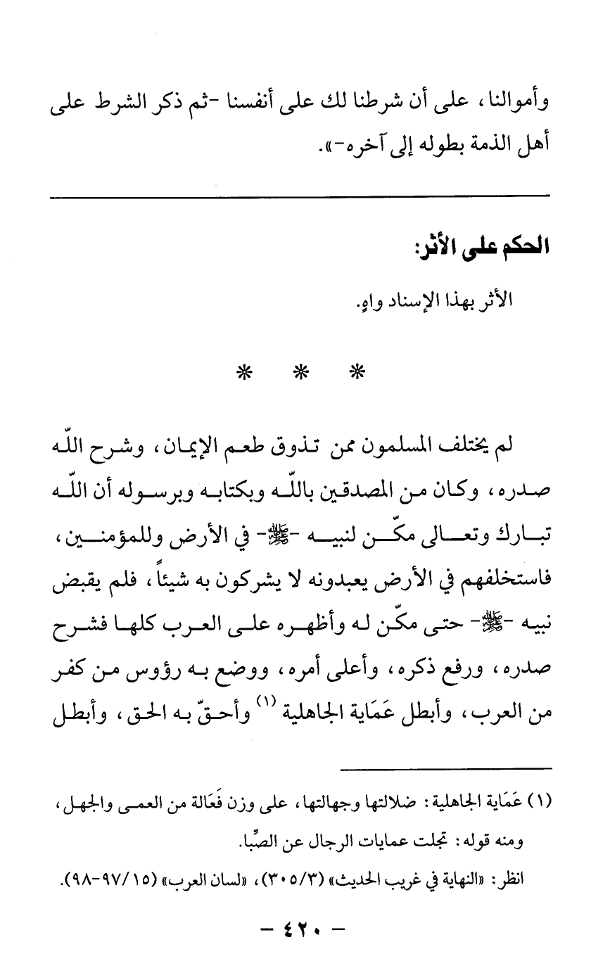 لم يختلف المسلمون ممن تذوق طعم الإيمان، وشرح الله صدره، وكان من المصدقين بالله وبكتابه وبرسوله أن الله تبارك وتعالى مكن لنبيه - صلى الله عليه وسلم - في الأرض وللمؤمنين، فاستخلفهم في الأرض يعبدونه لا يشركون به شيئاً، فلم يقبض نبيه - صلى الله عليه وسلم- حتى مكن له وأظهره على العرب كلها فشرح صدره، ورفع ذكره، وأعلى أمره، ووضع به رؤوس من كفر من العرب، وأبطل عماية الجاهلية وأحق به الحق، وأبطل -[421]- به الباطل، ثم قبضه إليه بعد أن أكمل به الدين وأتم به النعمة، قائما بأمره، ومؤديا لوحيه، صابراً محتسباً - صلى الله عليه وسلم-.