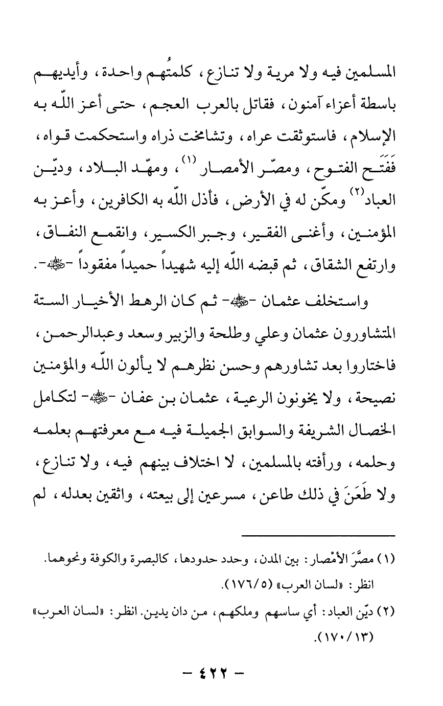 واستخلف عثمان -رضي الله عنه- ثم كان الرهط الأخيار الستة المتشاورون عثمان وعلي وطلحة والزبير وسعد وعبدالرحمن، فاختاروا بعد تشاورهم وحسن نظرهم لا يألون الله والمؤمنين نصيحة، ولا يخونون الرعية، عثمان بن عفان -رضي الله عنه- لتكامل الخصال الشريفة والسوابق الجميلة فيه مع معرفتهم بعلمه وحلمه، ورأفته بالمسلمين، لا اختلاف بينهم فيه، ولا تنازع، ولا طعن في ذلك طاعن، مسرعين إلى بيعته، واثقين بعدله، لم -[423]- يختلف عنه من تخلف عن أبي بكر، ولا تسخط ذلك من -[424]- تسخط عمر، مجمعين له بالرضا والمحبة، ففتح الله له أقاصي الأرض، ومكن له فيها، يحكم بالعدل، ويأمر بالحق، ويقفوا آثار النبي - صلى الله عليه وسلم - وصاحبيه، وسلك سبيلهم، ويحتذي حذوهم، حتى أكرمه الله بالشهادة التي شهد له رسول الله - صلى الله عليه وسلم - بها في كل موطن أخبر الناس أنه وأصحابه على الحق -[425]- عند ظهور الفتن واختلاف الناس فيها -رضي الله عنه-.