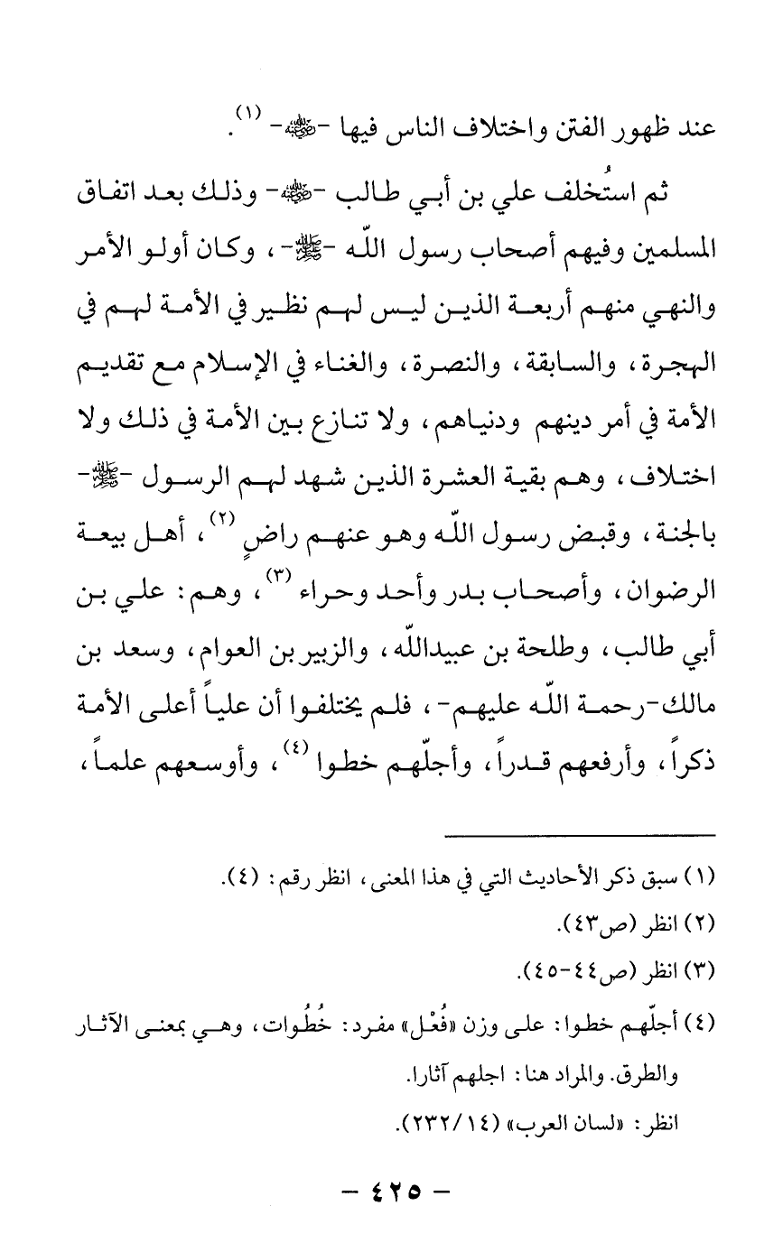 ثم استخلف علي بن أبي طالب -رضي الله عنه- وذلك بعد اتفاق المسلمين وفيهم أصحاب رسول الله - صلى الله عليه وسلم -، وكان أولو الأمر والنهي منهم أربعة الذين ليس لهم نظير في الأمة لهم في الهجرة، والسابقة، والنصرة، والغناء في الإسلام مع تقديم الأمة في أمر دينهم ودنياهم، ولا تنازع بين الأمة في ذلك ولا اختلاف، وهم بقية العشرة الذين شهد لهم الرسول - صلى الله عليه وسلم - بالجنة، وقبض رسول الله وهو عنهم راض، أهل بيعة الرضوان، وأصحاب بدر وأحد وحراء، وهم: علي بن أبي طالب، وطلحة بن عبيدالله، والزبير بن العوام، وسعد بن مالك - رحمة الله عليهم -، فلم يختلفوا أن علياً أعلى الأمة ذكراً، وأرفعهم قدراً، وأجلهم خطوا، وأوسعهم علماً، -[426]- وأعظمهم حلماً، وأفضلهم منزلة في الإسلام، وهجرته ونصرته وسوابقه وحسن بلائه، وعظيم غنائه، وتقدمه في الفضل والشرف، وفي كل مشهد كريم ومقام عظيم يحبه الله ورسوله، ويحب الله ورسوله، ويحبه المؤمنون، ويبغضه المنافقون، شهد له بذلك رسول الله - صلى الله عليه وسلم -، لا يقصر عن كل خطة رفيعة ومقام جليل، لا ينقصه تقدم من تقدمه من أصحاب رسول الله - صلى الله عليه وسلم - بل رفعته معرفته بفضل من قدمه على نفسه، إذ كان ذلك موجوداً فيمن هو أفضل منه قال الله تعالى: {تلك الرسل فضلنا بعضهم على بعض منهم من -[427]- كلم الله ورفع بعضهم درجات ... الآية}، ولم يكن فضل بعضهم على بعض بالذي يضع من دونه، وكل الرسل صفوة الله وخيرته من خلقه وبريته، - عليهم السلام-.