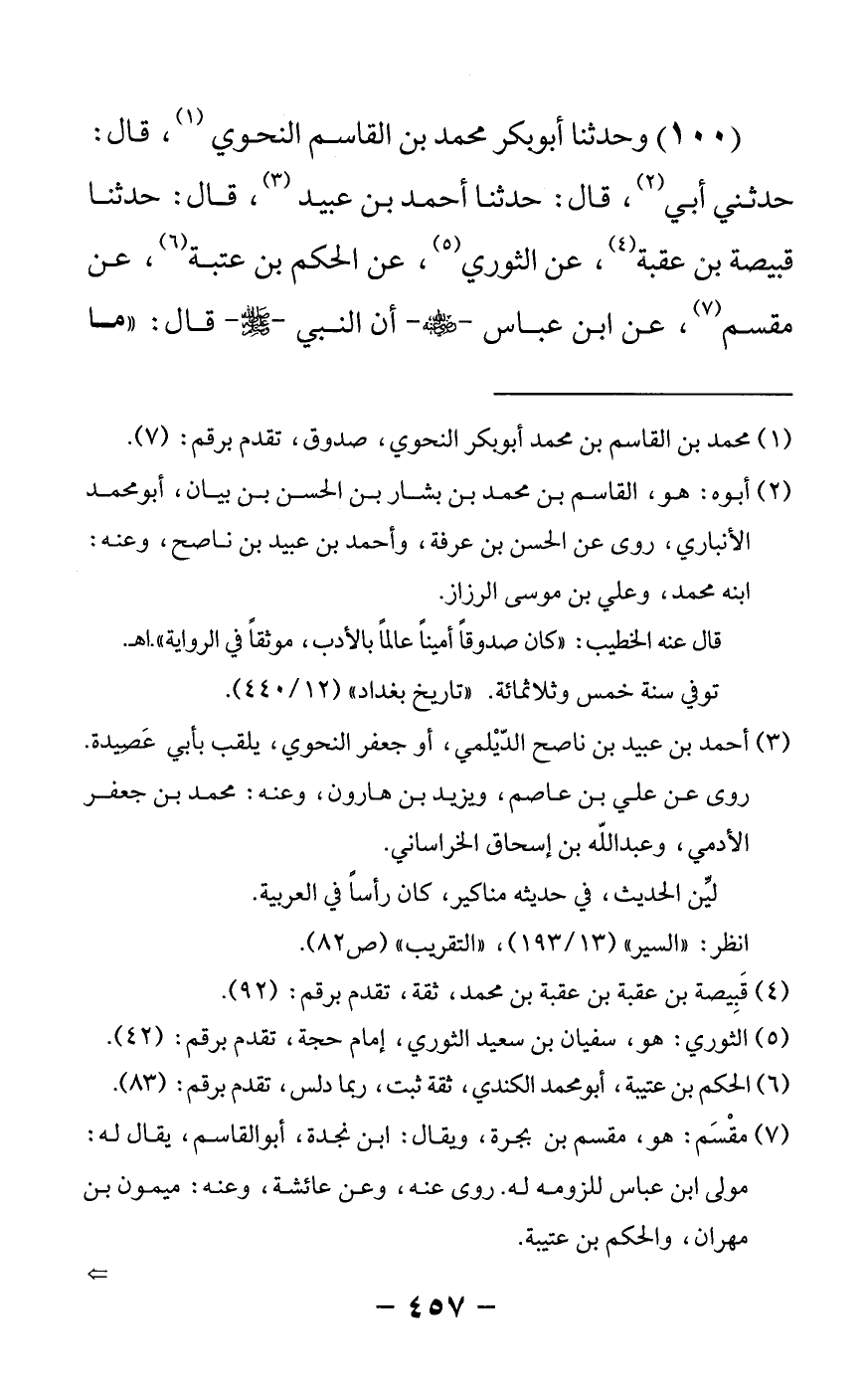 100 - وحدثنا أبو بكر محمد بن القاسم النحوي قال: حدثني أبي قال: حدثنا أحمد بن عبيد قال: حدثنا قبيصة بن عقبة عن الثوري عن الحكم بن عتبة عن مقسم عن ابن عباس رضي الله عنه أن النبي صلى الله عليه وسلم قال ما -[458]- دعوت أحدا إلى الإسلام إلا كان له فيه مرجوع وتردد إلا أبا بكر فإنه حين كلمته بالإسلام ما عَتَّم أن أسلم قال أبو بكر: قوله: "ما عَتَّم" أي ما أطرق وفكر، ولا قال لم وكيف؟.