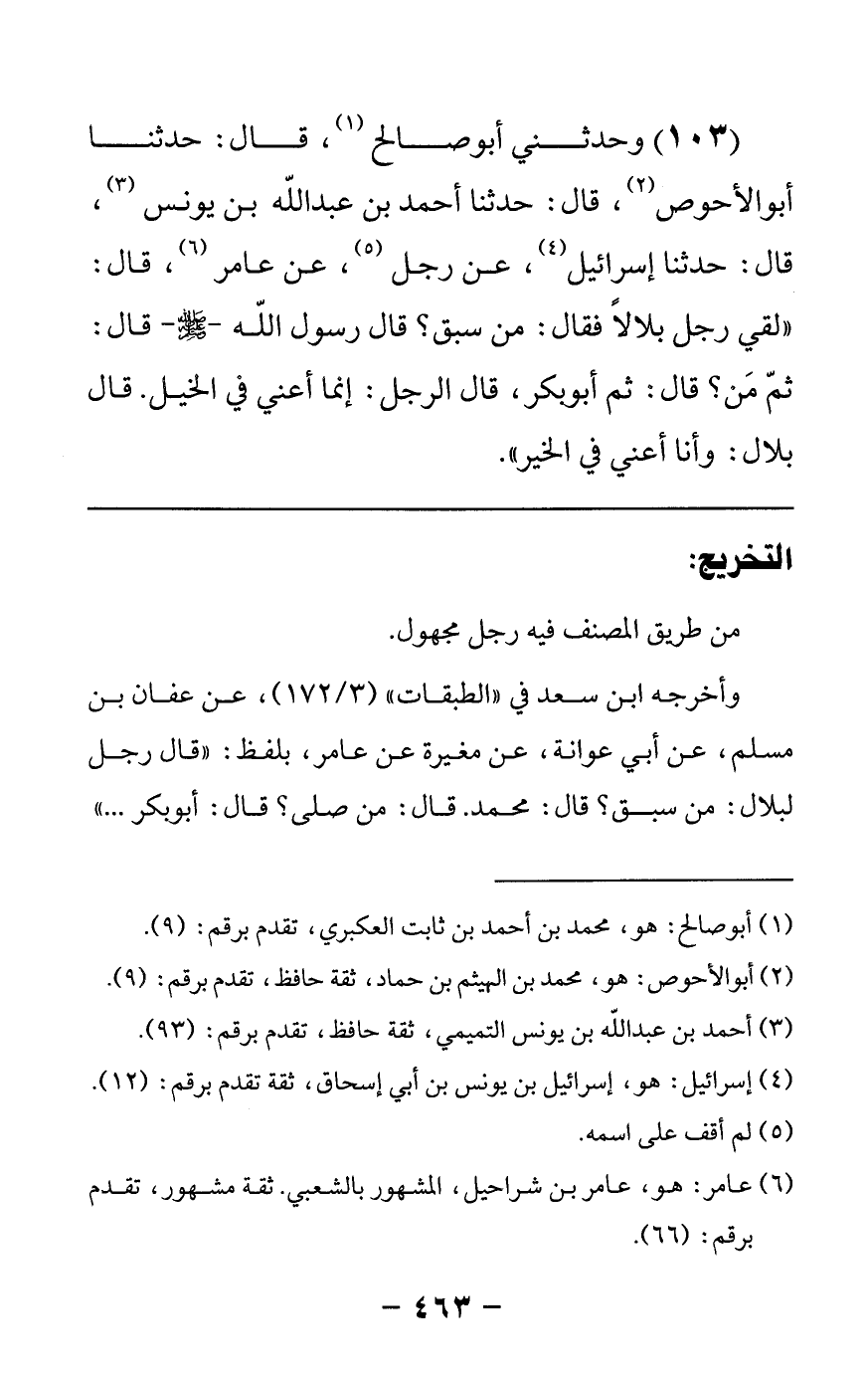 103 - وحدثني أبو صالح قال: حدثنا أبو الأحوص قال: حدثنا أحمد بن عبدالله بن يونس قال: حدثنا إسرائيل عن رجل عن عامر قال لقي رجل بلالا فقال من سبق قال رسول الله صلى الله عليه وسلم قال ثم من قال ثم أبو بكر قال الرجل إنما أعني في الخيل قال بلال وأنا أعني في الخير