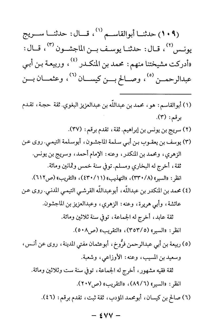 109 - حدثنا أبو القاسم قال: حدثنا سريج [بن] يونس قال: حدثنا يوسف بن الماجشون قال: أدركت مشيختنا منهم محمد بن المنكدر وربيعة بن أبي عبد الرحمن وصالح بن كيسان وعثمان بن -[478]- محمد لا يشكون أن أول القوم إسلاما أبو بكر رضي الله عنه