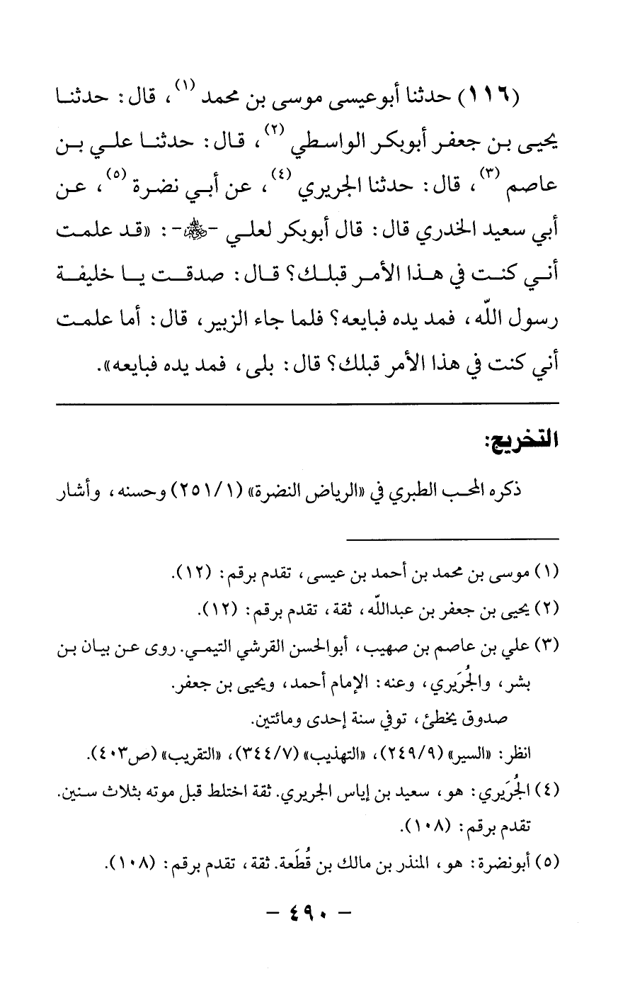 116 - حدثنا أبو عيسى موسى بن محمد قال: حدثنا يحيى بن جعفر أبو بكر الواسطي قال: حدثنا علي بن عاصم قال: حدثنا الجريري عن أبي نضرة عن أبي سعيد الخدري قال قال أبو بكر لعلي رضي الله عنه قد علمت أني كنت في هذا الأمر قبلك قال صدقت يا خليفة رسول الله صلى الله عليه وسلم فمد يده فبايعه فلما جاء الزبير قال أما علمت أني كنت في هذا الأمر قبلك قال بلى فمد يده فيايعه