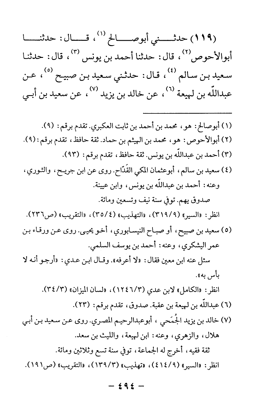 119 - حدثني أبو صالح قال: حدثنا أبو الأحوص قال: حدثنا أحمد بن يونس قال: حدثنا سعيد بن سالم قال: حدثني سعيد بن صبيح عن عبدالله بن لهيعة عن خالد بن يزيد عن سعيد بن أبي -[495]- هلال قال لما نزلت {ولو أنا كتبنا عليهم أن اقتلوا أنفسكم} قال أبو بكر والله لو فعل لفعلنا فقال رسول الله صلى الله عليه وسلم إن في أصحابي لرجالا الإيمان أثبت في قلوبهم من الجبال الرواسي