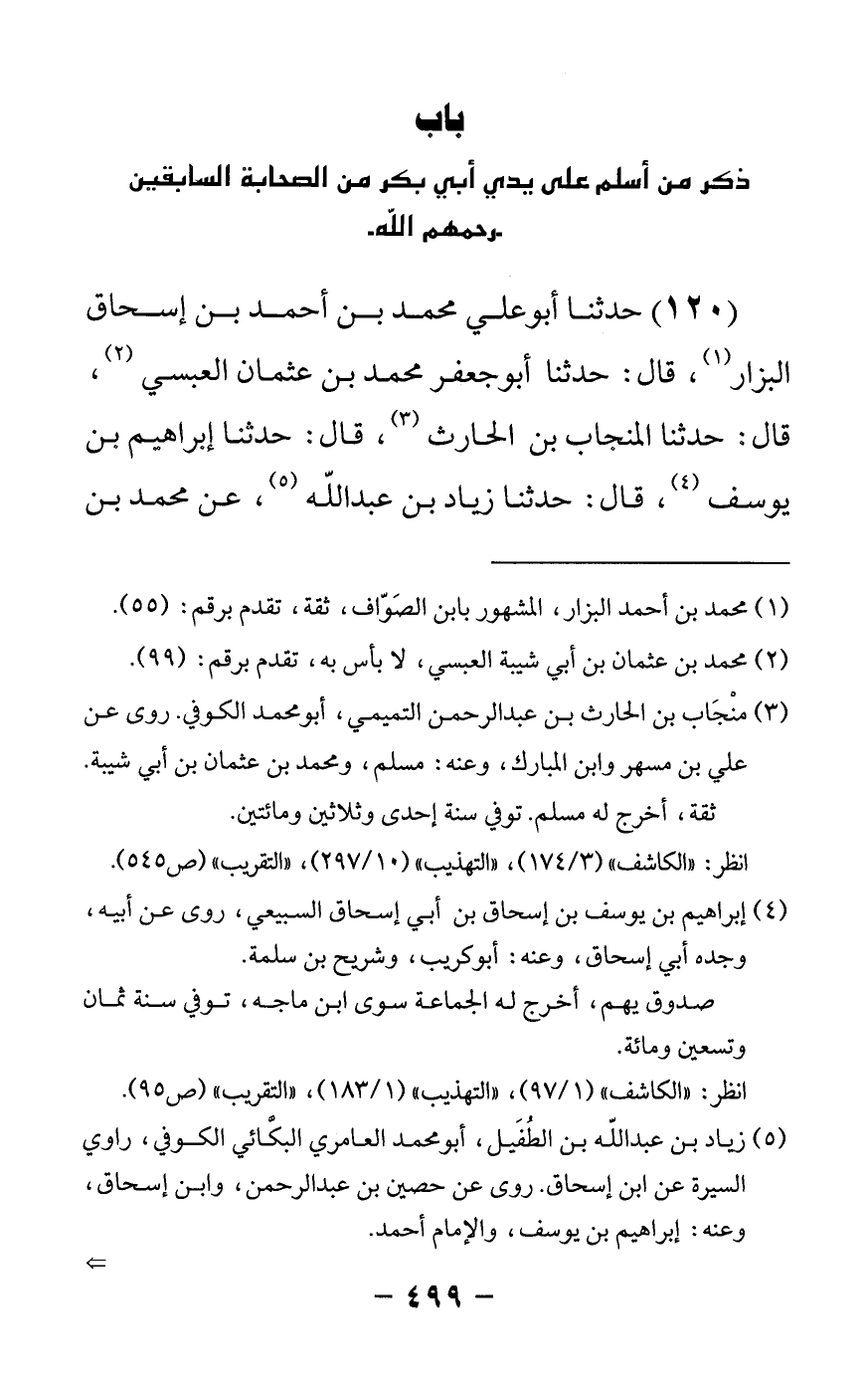 120 - حدثنا أبو علي محمد بن أحمد بن إسحاق البزار قال: حدثنا أبو جعفر محمد بن عثمان العبسي قال: حدثنا المنجاب بن الحارث قال: حدثنا إبراهيم بن يوسف قال: حدثنا زياد بن عبدالله عن محمد بن -[500]- إسحاق عن محمد بن عبد الرحمن بن عبدالله بن الحصين التيمي قال كان أبو بكر رحمه الله رجلا مألفا لقومه محببا سهلا وكان أنسب قريش لقريش وأعلم قريش بما يكون من خير أو شر وكان رجلا تاجرا ذا خلق ومعروف وكان رجال قومه يأتونه ويألفونه لغير واحد من الأمر لعلمه وتجارته وحسن مجالسته فجعل يدعو إلى -[501]- الإسلام كل من وثق به من قومه ممن يغشاه ويجلس إليه فأسلم على يديه فيما بلغني عثمان بن عفان والزبير بن العوام وعبد الرحمن بن عوف وسعد بن أبي وقاص وطلحة بن عبيدالله فجاء بهم إلى رسول الله صلى الله عليه وسلم حتى استجابوا وأسلموا وصلوا