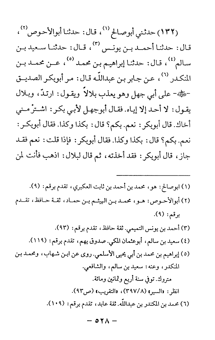 132 - حدثني أبو صالح قال: حدثنا أبو الأحوص قال: حدثنا أحمد بن يونس قال: حدثنا سعيد بن سالم قال: حدثنا إبراهيم بن محمد عن محمد بن المنكدر عن جابر بن عبدالله قال مر أبو بكر الصديق رضي الله عنه على أبي جهل وهو يعذب بلالا ويقول ارتد وبلال يقول لا أحد إلا إياه فقال أبو جهل لأبي بكر اشتر مني أخاك قال أبو بكر نعم بكم قال بكذا وكذا فقال أبو بكر فإذا قلت نعم فقد جاز قال أبو بكر فقد أخذته ثم قال لبلال اذهب فأنت لمن -[529]- أسلمت له