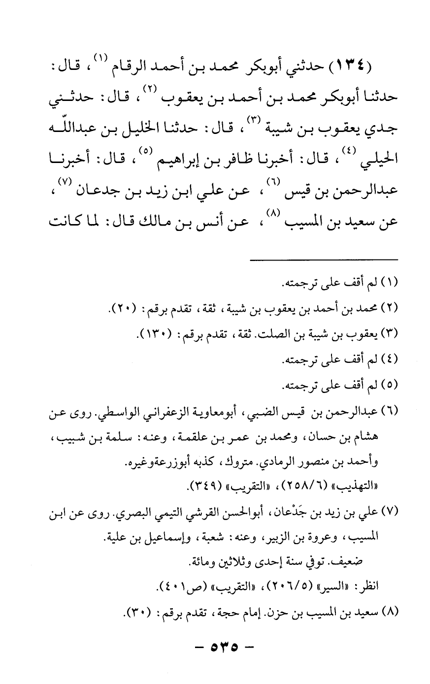 134 - حدثني أبو بكر محمد بن أحمد الرقام قال حدثنا أبو بكر محمد بن أحمد بن يعقوب قال: حدثني جدي يعقوب بن شيبة قال: حدثنا الخليل بن عبدالله الحيلي قال أخبرنا ظافر بن إبراهيم قال: أخبرنا عبد الرحمن بن قيس عن علي بن زيد بن جدعان عن سعيد بن المسيب عن أنس بن مالك قال لما كانت -[536]- ليلة الغار قال أبو بكر يا رسول الله ائذن لي فأدخل قبلك فإن كانت وحية أو قال حية أو شيء كانت بي دونك فأذن له فجعل يلتمس الغار بيده فلا يمر بجحر إلا شق من ثوبه فألقمه الجحر فلما أتى على الثوب كله بقي جحر واحد فألقمه عقبه, ثم قال: ادخل يا رسول الله فلما أضاء لهما الصبح قال النبي صلى الله عليه وسلم يا أبا بكر ما فعل ثوبك فأخبره بما صنع فرفع يديه فقال اللهم اجعل أبا بكر معي في درجتي في الجنة فأوحي إليه أن قد استجيب لك