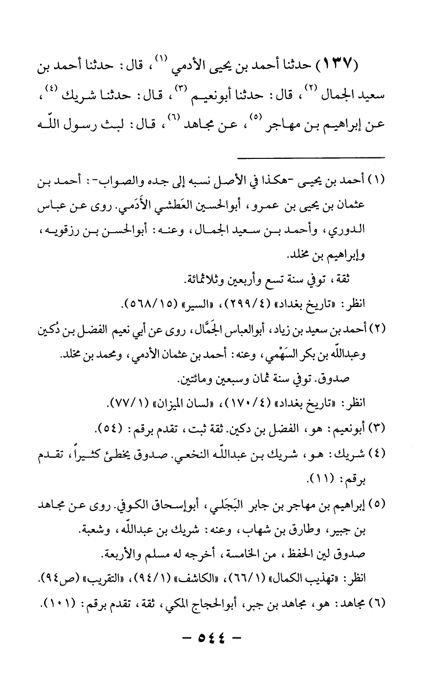 137 - حدثنا أحمد بن يحيى الأدمي قال: حدثنا أحمد بن سعيد الجمال قال: حدثنا أبو نعيم قال: حدثنا شريك عن إبراهيم بن مهاجر عن مجاهد قال لبث رسول الله -[545]- صلى الله عليه وسلم وأبو بكر رضي الله عنه في الغار ثلاثا