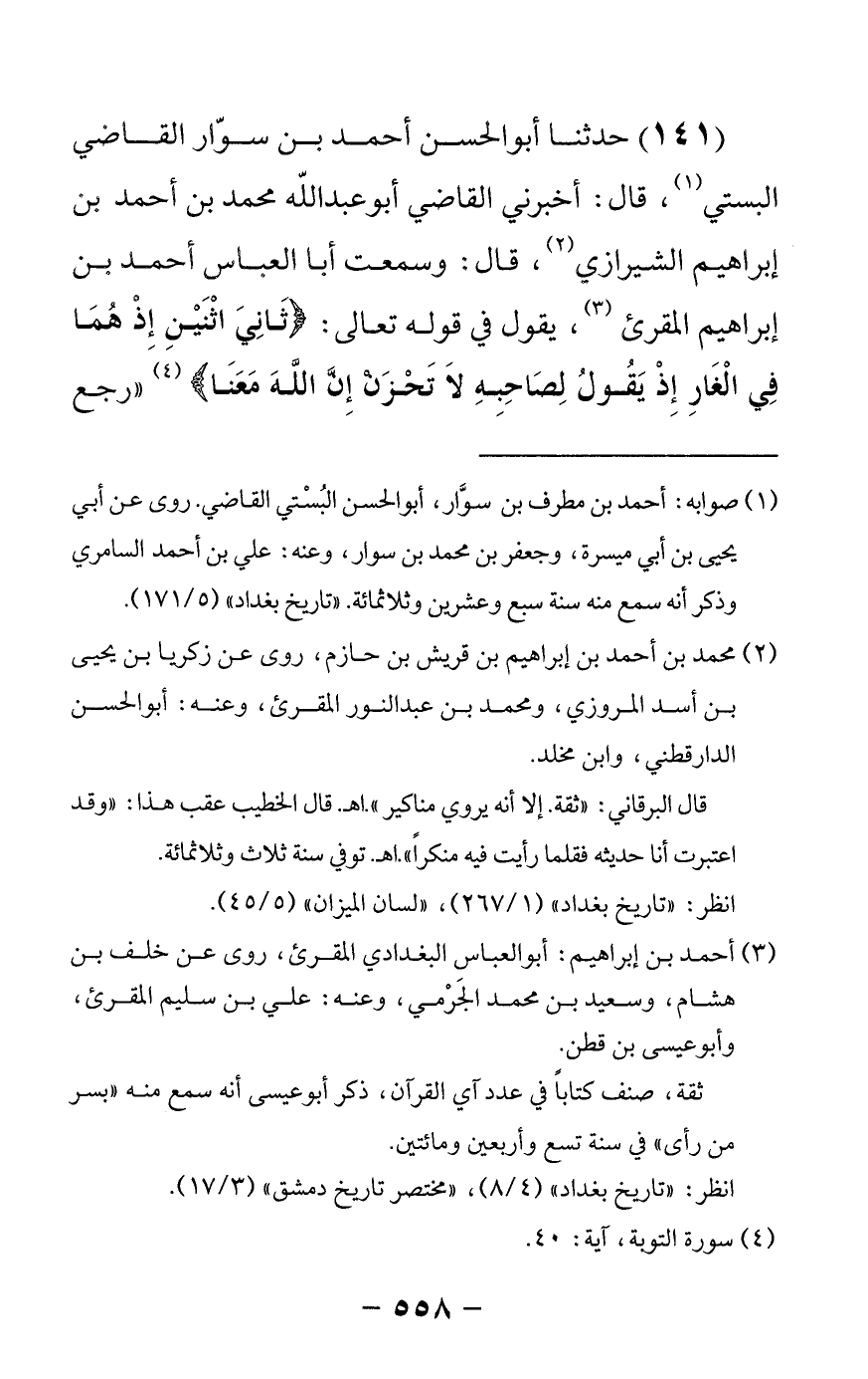 141 - حدثنا أبو الحسن أحمد بن سوار القاضي البستي قال: أخبرني القاضي أبو عبدالله محمد بن أحمد بن إبراهيم الشيرازي قال: وسمعت أبا العباس أحمد بن إبراهيم المقرئ يقول في قوله تعالى {ثاني اثنين إذا هما في الغار إذ يقول لصاحبه لا تحزن إن الله معنا} رجع -[559]- الكلام إلى رسول الله صلى الله عليه وسلم ومما دل على ذلك {إلا تنصروه فقد نصره الله إذ أخرجه الذين كفروا} وإنما المخرج النبي صلى الله عليه وسلم إذ يقول لصاحبه فثبت الله تعالى لأبي بكر رضي الله عنه صحبة رسول الله صلى الله عليه وسلم وأخبر أن الله معهما وأنزل السكينة على أبي بكر وذلك أن السكينة كانت مع رسول الله صلى الله عليه وسلم وكان أبو بكر خائفا أن يظهر عليهما أعداؤهما وأيده بجنود لم تروها يجوز أن يريد بذلك النبي صلى الله عليه وسلم ويجوز أن يكون أراد بذلك أبا بكر وذلك جائز غير منكر وذلك أن الله تعالى يقول {هو الذي أنزل السكينة في قلوب المؤمنين} وقال {واذكروا إذ أنتم قليل مستضعفون في الأرض تخافون أن يتخطفكم الناس فآواكم وأيدكم بنصره} وذلك التأييد برسول الله صلى الله عليه وسلم
