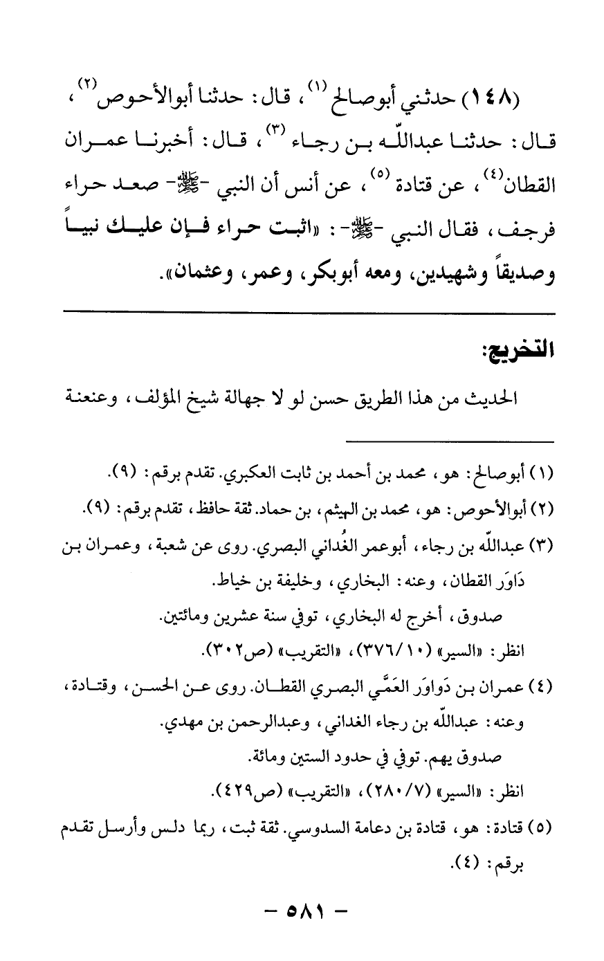 148 - حدثني أبو صالح قال: حدثنا أبو الأحوص قال: حدثنا عبدالله بن رجاء قال: أخبرنا عمران القطان عن قتادة عن أنس أن النبي صلى الله عليه وسلم صعد حراء فرجف فقال النبي صلى الله عليه وسلم اثبت حراء فإن عليك نبيا وصديقا وشهيدين ومعه أبو بكر وعمر وعثمان