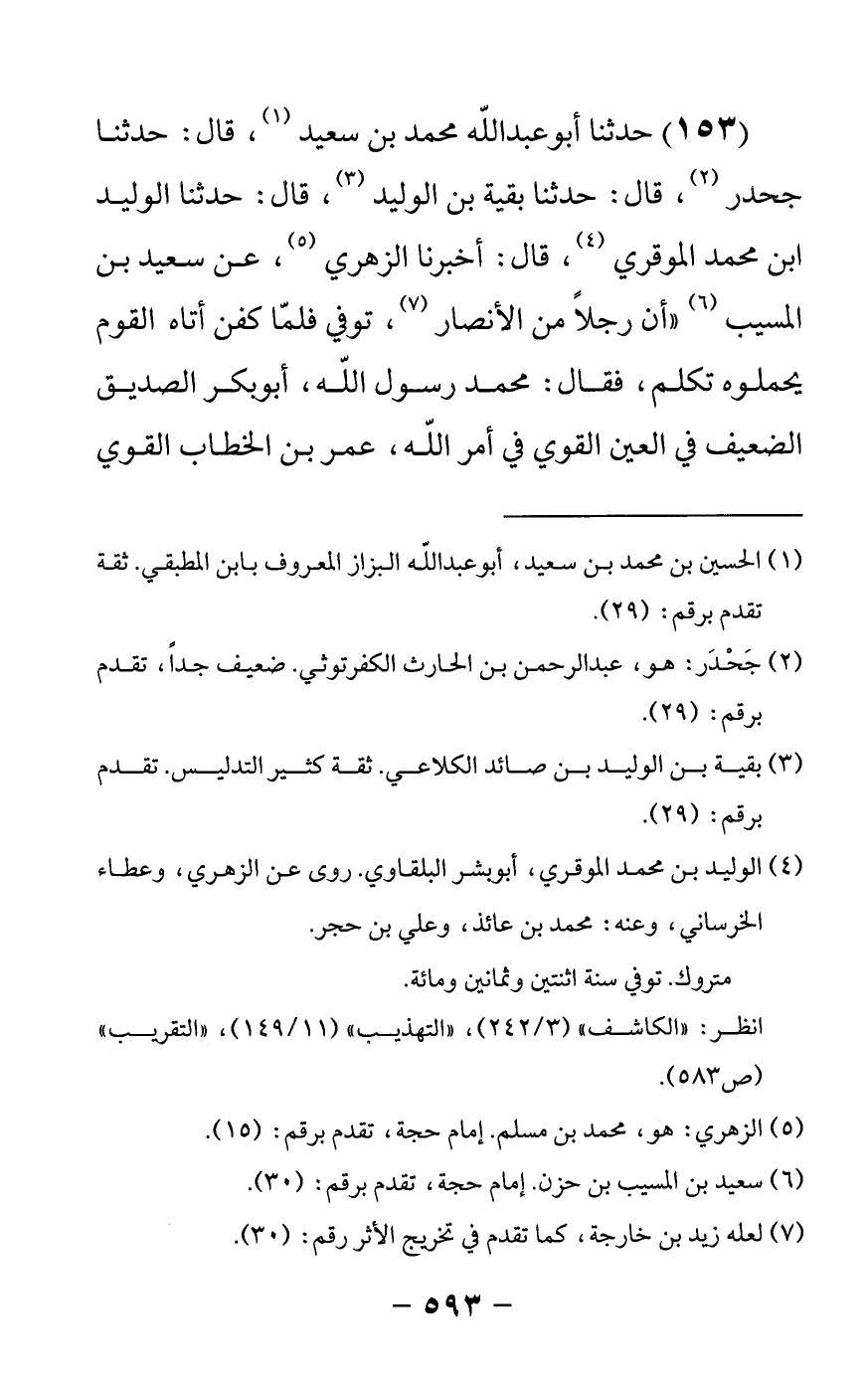 153 - حدثنا أبو عبدالله محمد بن سعيد قال: حدثنا جحدر قال: حدثنا بقية بن الوليد قال: حدثنا الوليد بن محمد الموقري قال: أخبرنا الزهري عن سعيد بن المسيب أن رجلا من الأنصار توفي فلما كفن أتاه القوم يحملوه تكلم فقال محمد رسول الله أبو بكر الصديق الضعيف في العين القوي في أمر الله عمر بن الخطاب القوي -[594]- الأمين عثمان بن عفان على منهاجهم