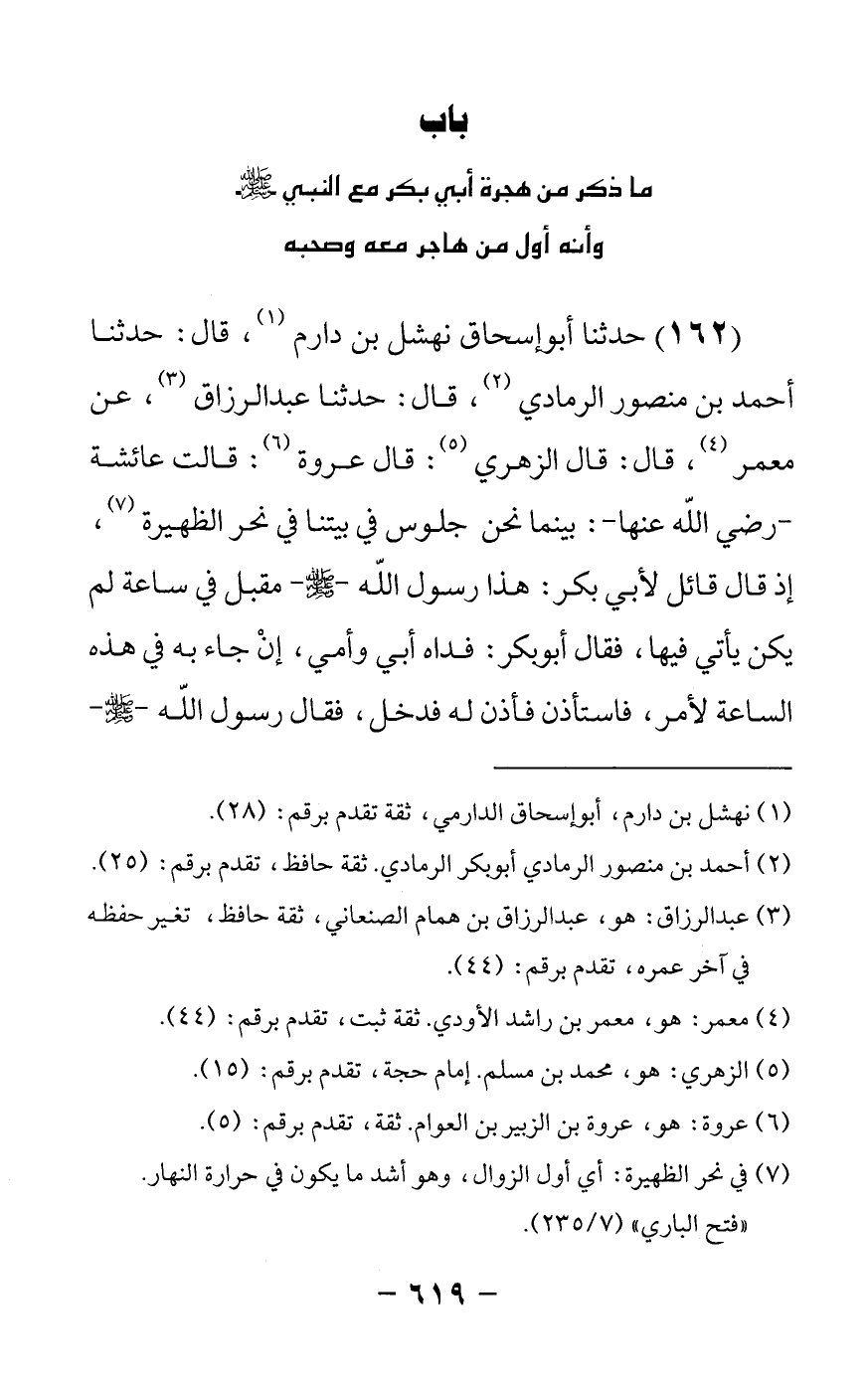 162 - حدثنا أبو إسحاق نهشل بن دارم قال: حدثنا أحمد بن منصور الرمادي قال: حدثنا عبد الرزاق عن معمر قال قال الزهري قال عروة قالت عائشة رضي الله عنها بينما نحن جلوس في بيتنا في نحر الظهيرة إذ قال قائل لأبي بكر هذا رسول الله صلى الله عليه وسلم مقبل في ساعة لم يكن يأتي فيها فقال أبو بكر فداه أبي وأمي إن جاء به في هذه الساعة لأمر فاستأذن فأذن له فدخل فقال رسول الله صلى الله عليه وسلم -[620]- لأبي بكر حين دخل أخرج من عندك فقال أبو بكر إنما هم أهلك بأبي أنت يا رسول الله فقال رسول الله صلى الله عليه وسلم فإنه قد أذن لي في الخروج فقال أبو بكر فالصحابة بأبي أنت يا رسول الله فقال النبي صلى الله عليه وسلم نعم فقال أبو بكر فخذ بأبي أنت إحدى راحلتي هاتين قالت فجهزناهما أحث الجهاز فصنعنا لهما سفرة في جراب فقطعت أسماء بنت أبي بكر من نطاقها فأوكت به الجراب فلذلك كانت -[621]- تسمى ذات النطاق ثم لحق النبي صلى الله عليه وسلم وأبو بكر بغار في جبل يقال له ثور