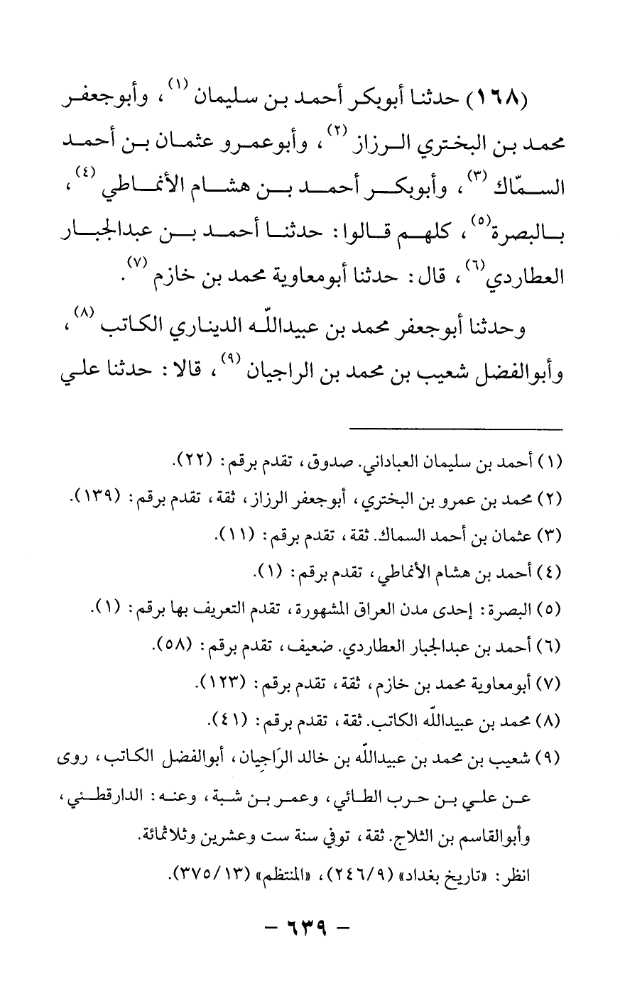 168 - حدثنا أبو بكر أحمد بن سليمان وأبو جعفر محمد بن البختري الرزاز وأبو عمرو عثمان بن أحمد السماك وأبو بكر أحمد بن هشام الأنماطي بالبصرة كلهم قالوا حدثنا أحمد بن عبد الجبار العطاردي قال: حدثنا أبو معاوية محمد بن خازم وحدثنا أبو جعفر محمد بن عبيدالله الديناري الكاتب وأبو الفضل شعيب بن محمد بن الراجيان قالا حدثنا علي -[640]- بن حرب وحدثنا أبو الحسن أحمد بن محمد بن يزيد الزعفراني وأبو محمد عبدالله بن جعفر الكفي قالا حدثنا الحسن بن عرفة العبدي قالا حدثنا أبو معاوية عن الأعمش عن أبي صالح عن أبي هريرة قال: قال رسول الله صلى الله عليه وسلم ما نفعني مال قط ما نفعني مال أبي بكر قال فبكى أبو بكر رحمه الله وقال هل أنا ومالي إلا لك يا رسول الله؟