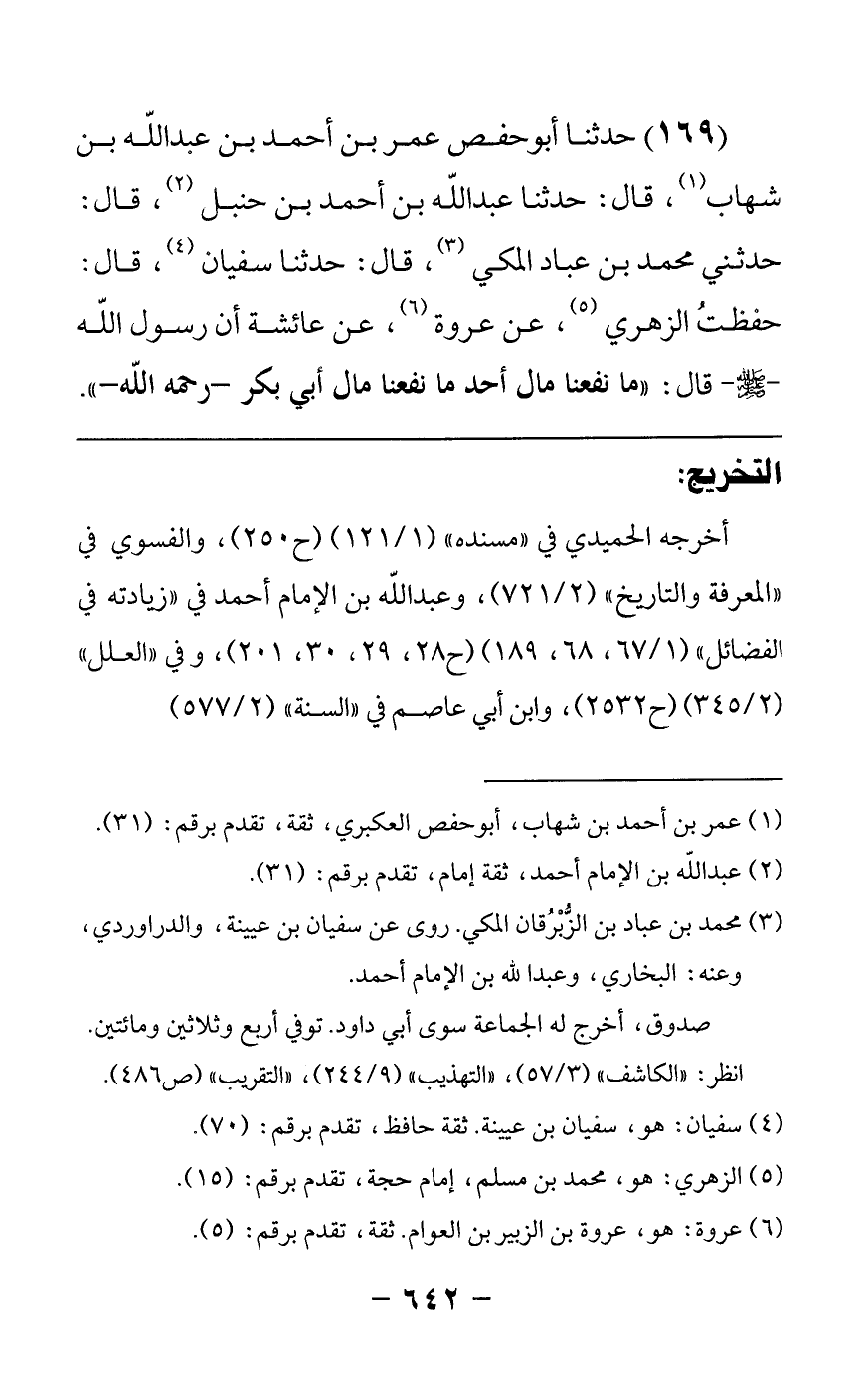 169 - حدثنا أبو حفص عمر بن أحمد بن عبدالله بن شهاب قال: حدثنا عبدالله بن أحمد بن حنبل قال: حدثني محمد بن عباد المكي قال: حدثنا سفيان قال: حفظت الزهري عن عروة عن عائشة رضي الله عنها أن رسول الله صلى الله عليه وسلم قال ما نفعنا مال أحد ما نفعنا مال أبي بكر رحمه الله